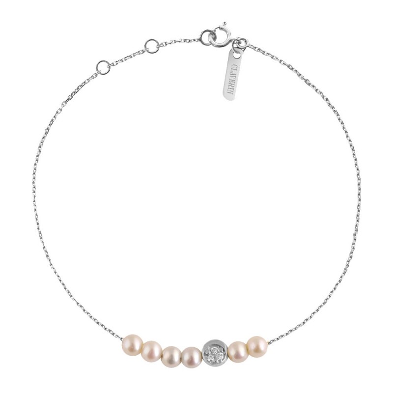 Bracelet 6 white pearls of 3/4 mm and a diamond moon - mini diamond moon pattern, half-moon in 18-carat white gold set with diamonds- on fine 18 carats white gold chain (17.5 cm) with dual ring to fit to the wrist's size.The pearls are attached to the chain.