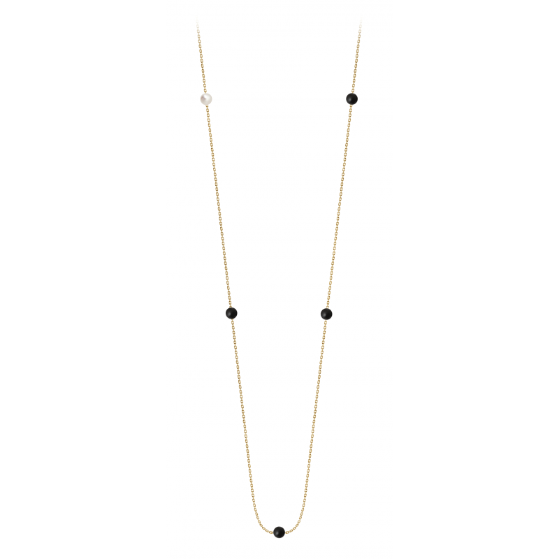 Give Me 5 Necklace, 4 agate pearls (3/4 mm) linked to a symmetrical white pearl on a 18 carat yellow gold chain. Length: 38/40/42 cm. Weight of gold: 1 gram