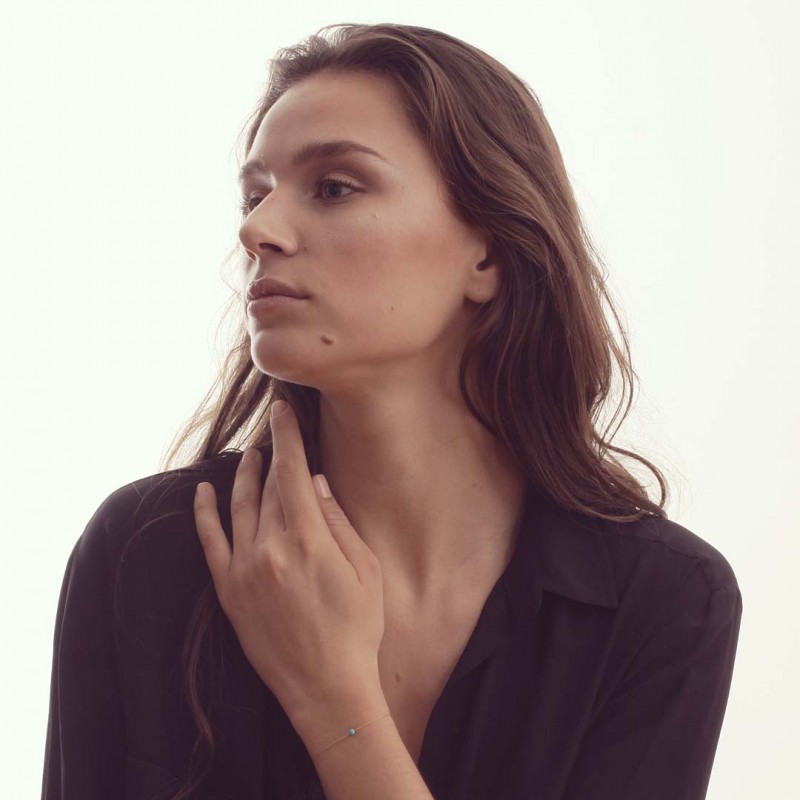 Bracelet with turquoise pearl (3/4 mm) on a fine yellow gold chain (17 cm) with ring to adjust to wrist's size. Total weight of gold: .60 gram
