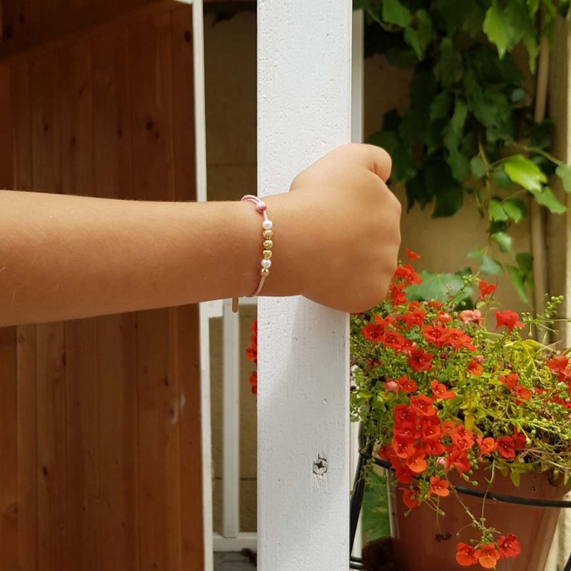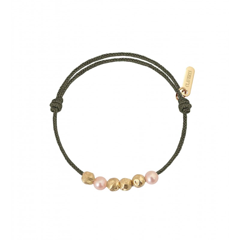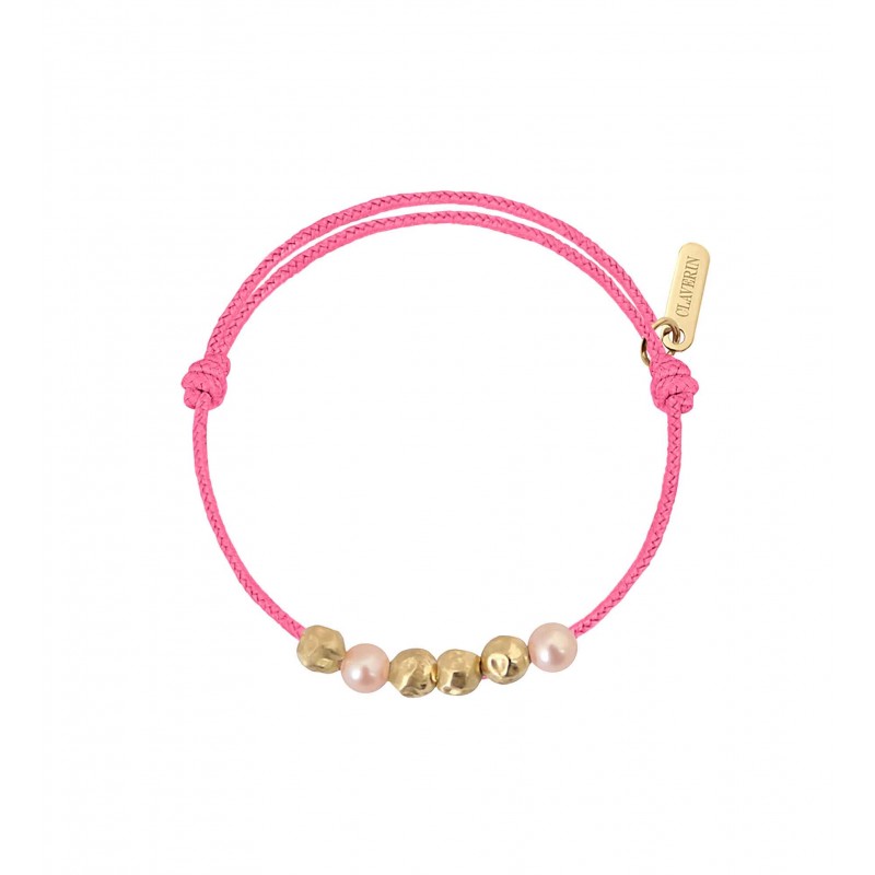 Yellow gold beads (18 carats) hammered by hand and cultured pink pearls (3.5/4mm), yellow gold Claverin plate on cord bracelet adjustable by sliding knots.