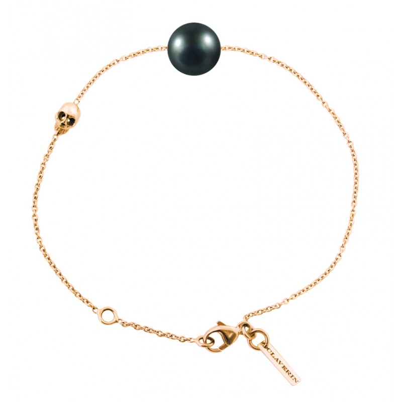 Black Tahitian pearl bracelet 7/7.5 mm, skull and crossbones motif on a fine yellow gold chain (17 cm) with ring setting to adjust to wrist’s size (15 cm). Total weight of gold: 1.6 grams.