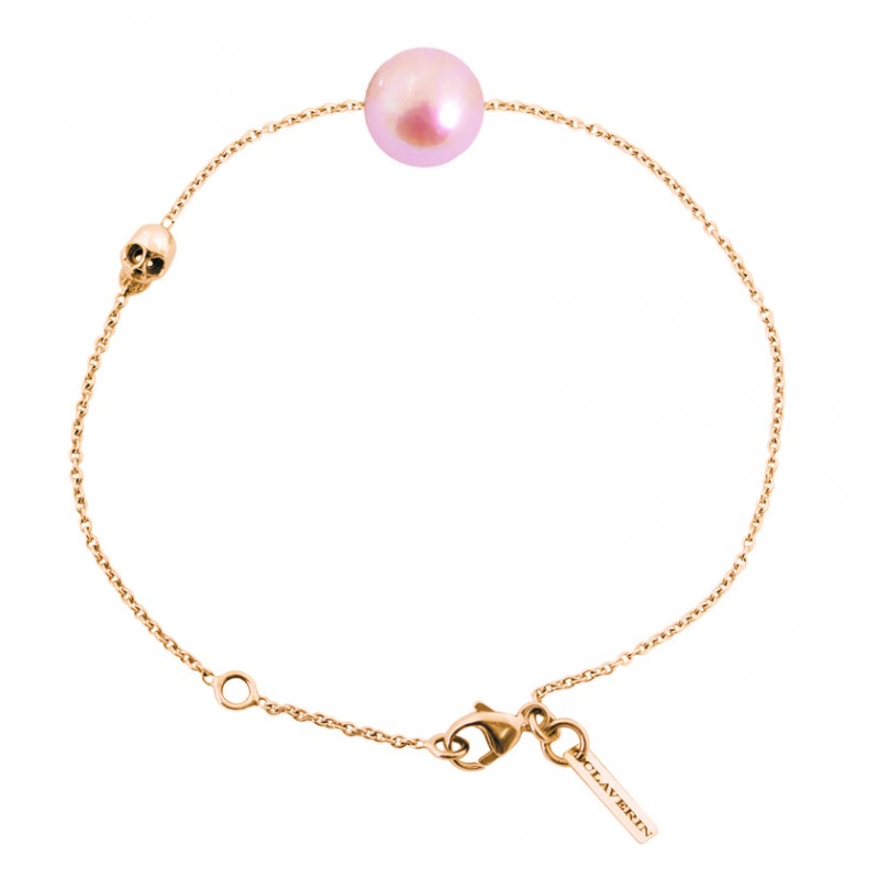 Pink pearl bracelet on 18 carat yellow gold chain (17 cm) with 15 cm. band with 18 carat yellow gold skull and crossbones motif.