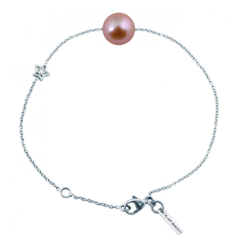 Pink pearl bracelet (diameter: 7/7.5 mm) on white gold chain (17 cm.) with ring to adjust to wrist's size (15 cm) with. 18 carat white gold diamond star motif.