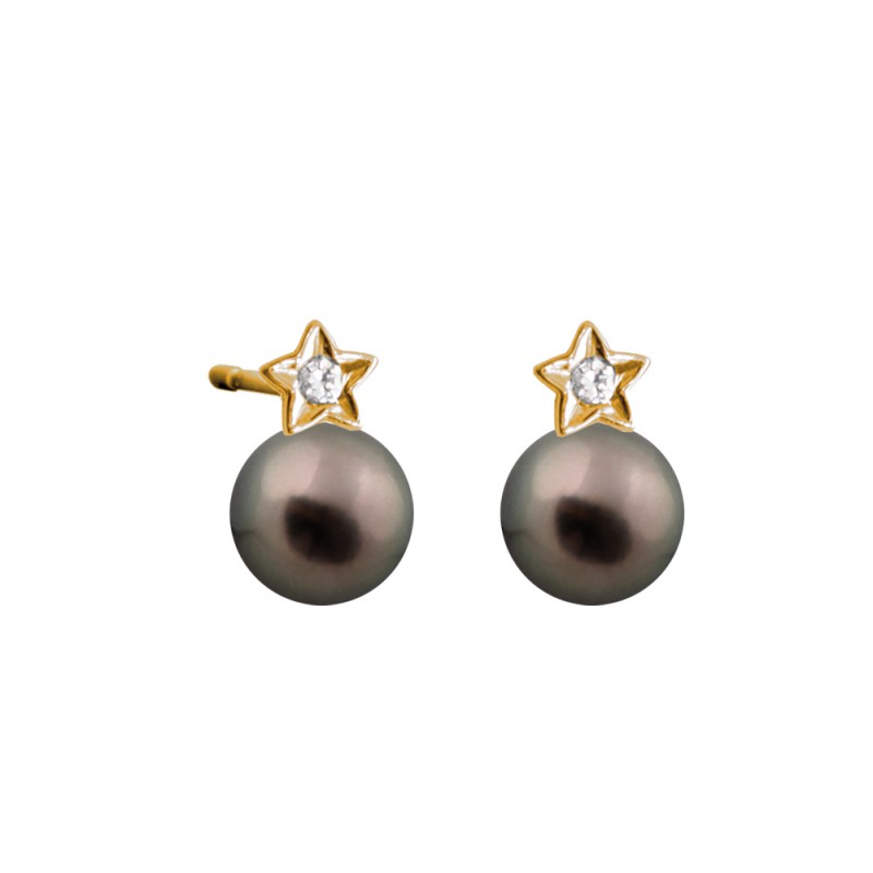 Black Tahitian pearl earrings (7/7.5 mm) linked to a star with diamond, 18 carat yellow gold.