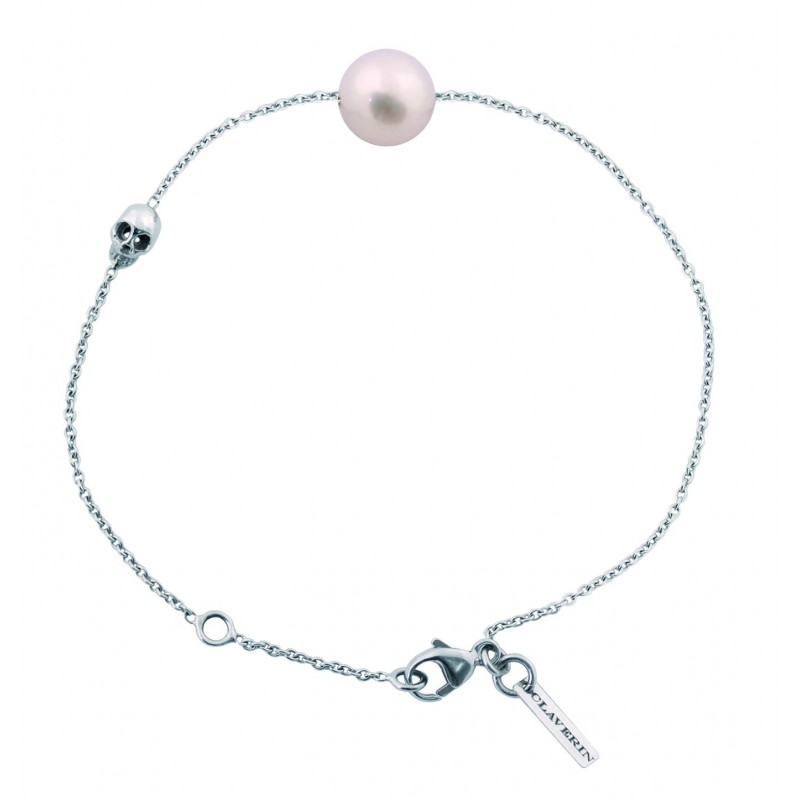 White pearl bracelet (7 mm) on 18-carat white gold chain of 17.5 cm with counter-ring at 15.5 and 16.5 cm, skull motif in 18-carat white gold