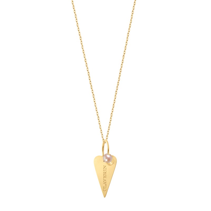 18-carat yellow gold necklace composed of a 1.6 cm high heart engraved with Claverin and a ring adorned with a 3.5/4 mm white pearl on an 18-carat yellow gold chain that can be worn at two lengths (42 or 45 cm thanks to the counter-ring).