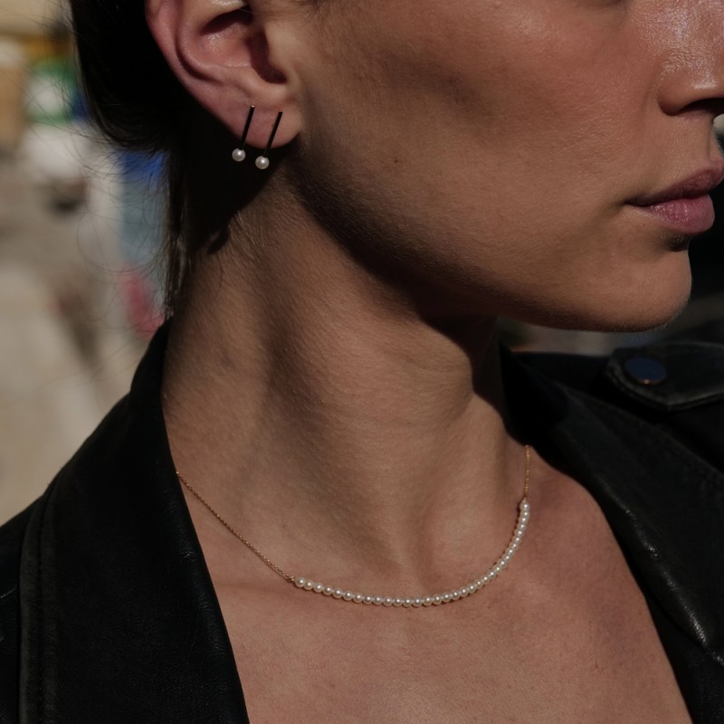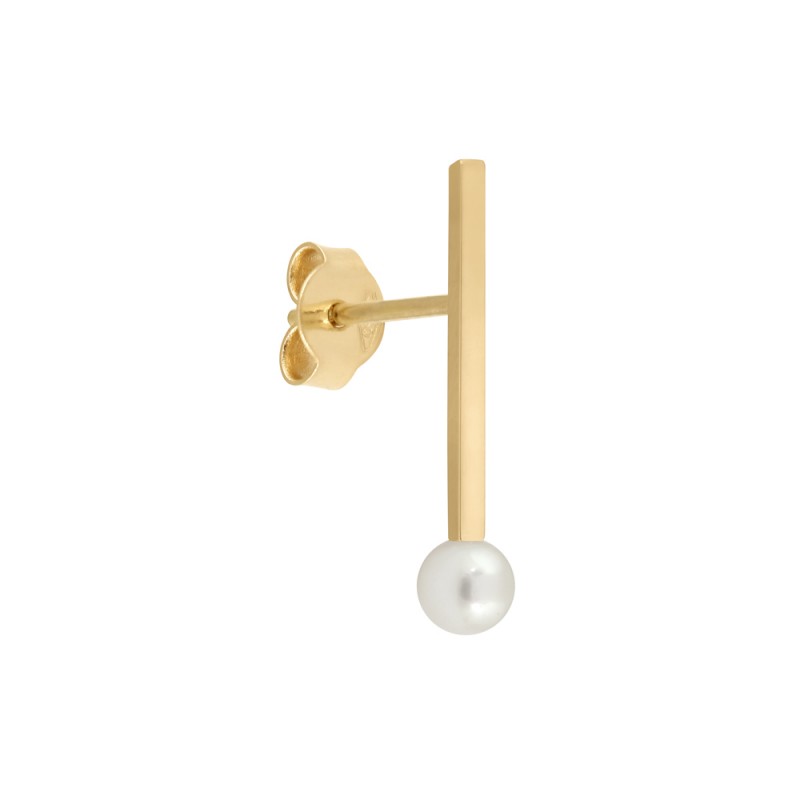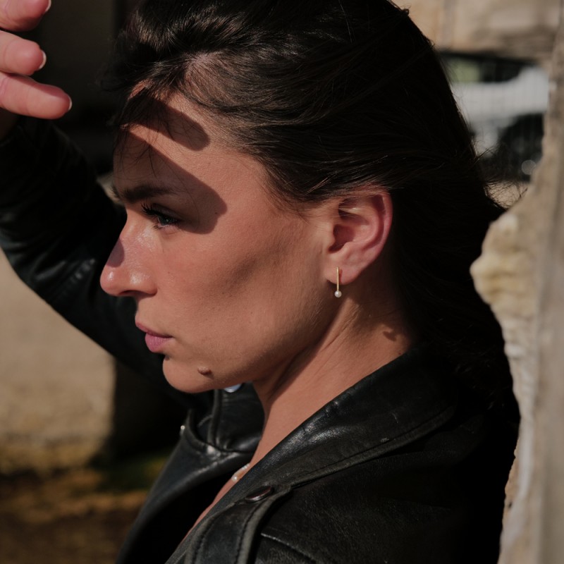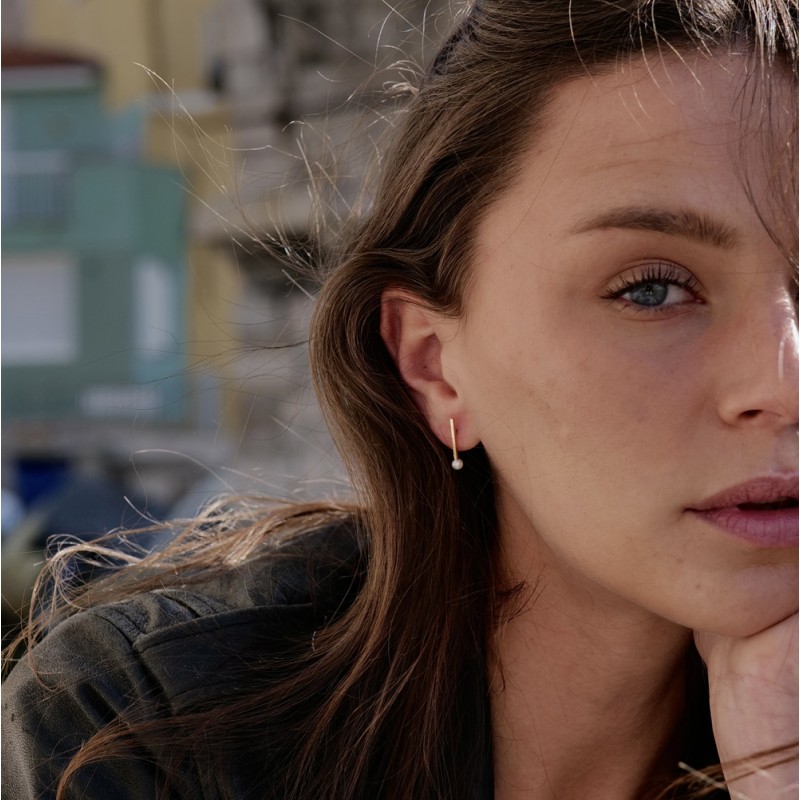 The Line single earring is made of a thin gold bar. The bar brings a contemporary and minimalist touch. At the end of this bar, a cultured pearl adds a subtle but elegant dimension to the whole. A special feature of this earring is that it can be worn in a classic way or placed on the earlobe for a more offbeat look.