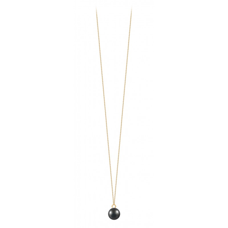 18 carat yellow gold long necklace, cultured black pearl (9 mm) on jump ring, Claverin plate at clasp, length of chain: 60 cm. Weight of gold: Approximately 1.7 grams