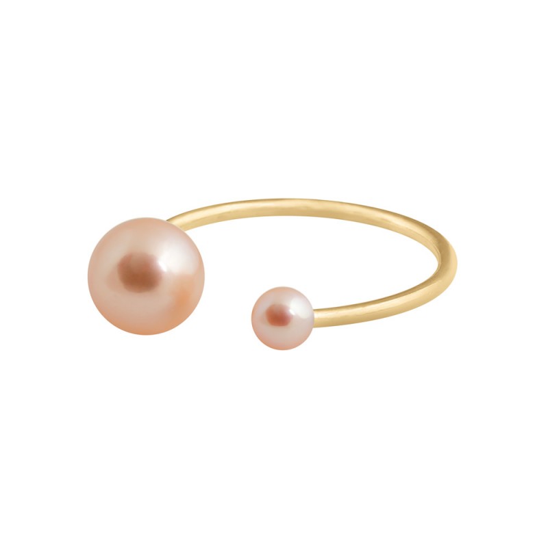 Hanging one ring, 1mm diameter 18K yellow gold wire and 3.5/4mm and 7/7.5mm pink cultured pearls