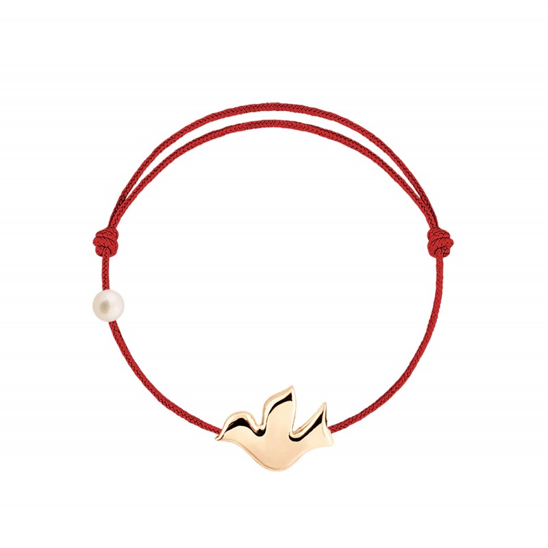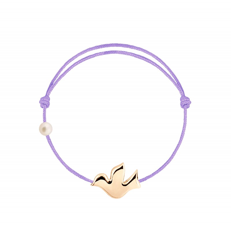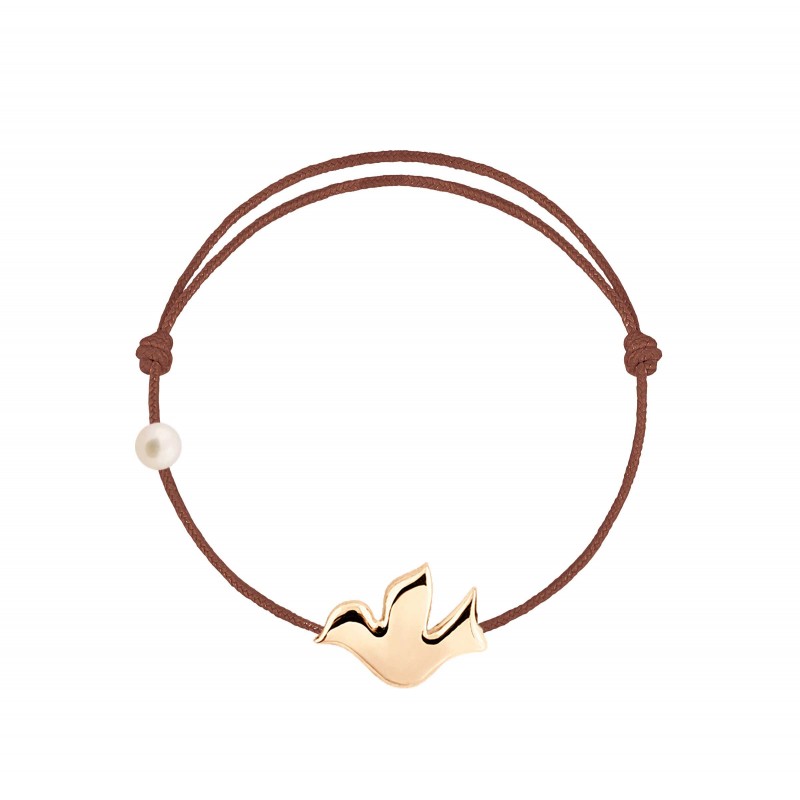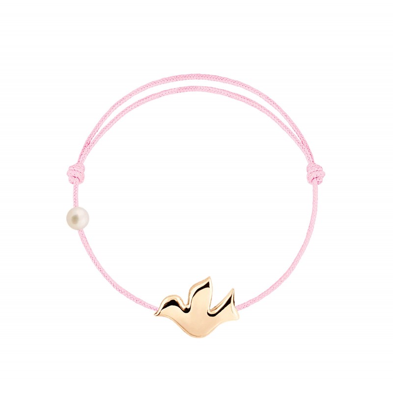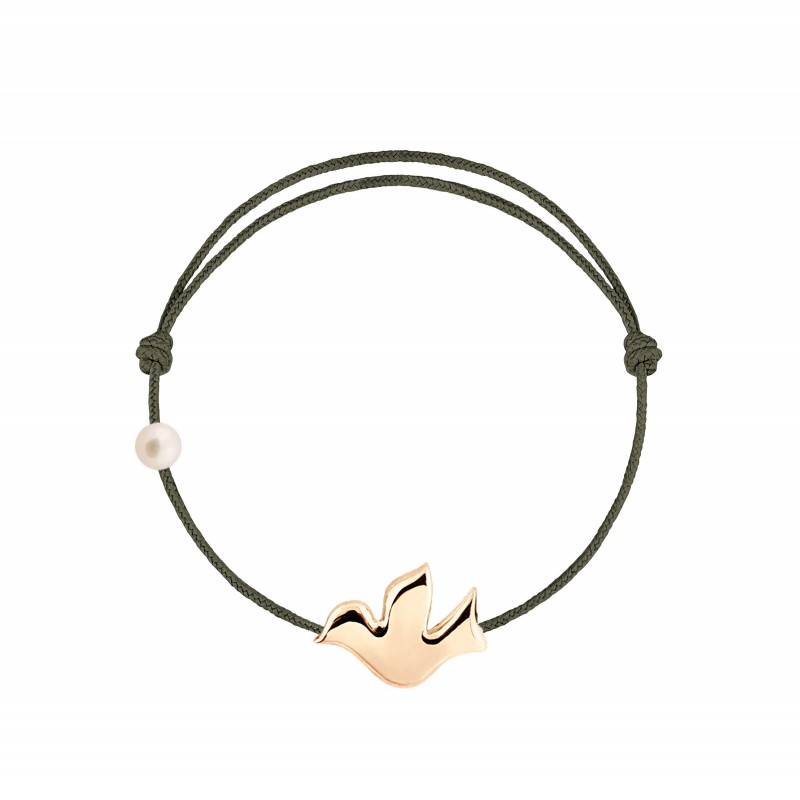 18-carat pink gold dove, Claverin engraved on the back, and 3 mm white cultured pearl on a cord bracelet, adjustable with sliding knots. The dove is attached by invisible fasteners, the pearl is free and can be moved on the cord. Several cord bracelet colors available, also available in yellow gold and white gold.