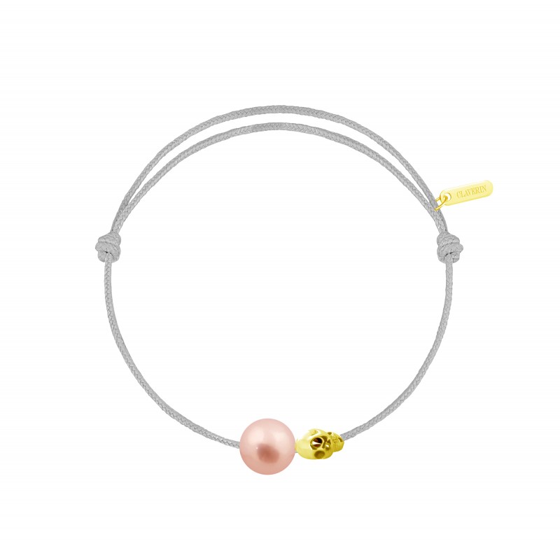 Cord bracelet, adjustable with sliding knot and one pink cultured pearl (7/8 mm), 18 carat yellow gold skull and crossbones motif.