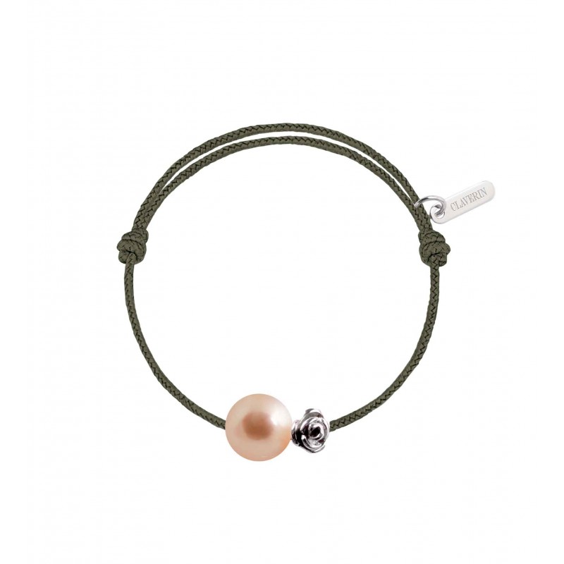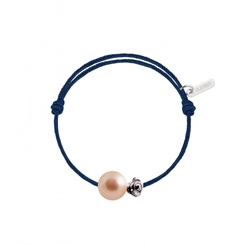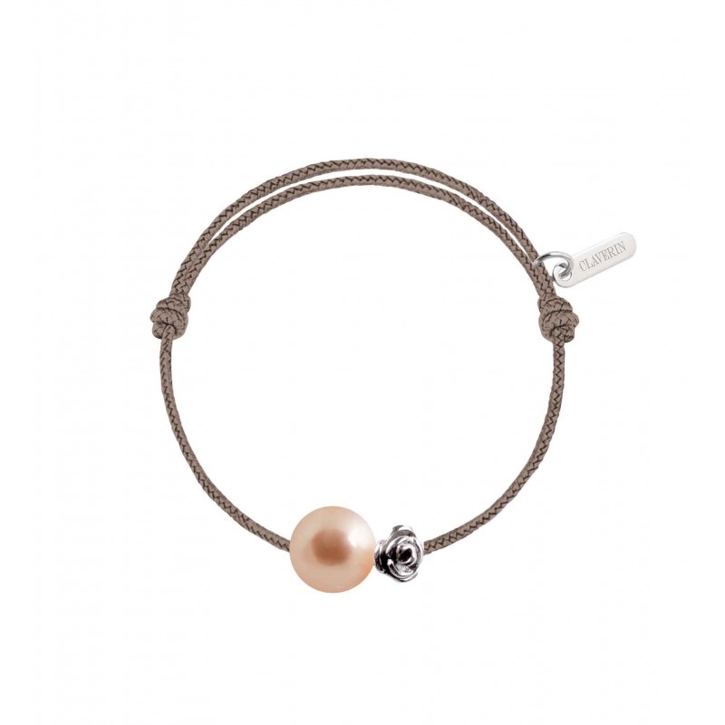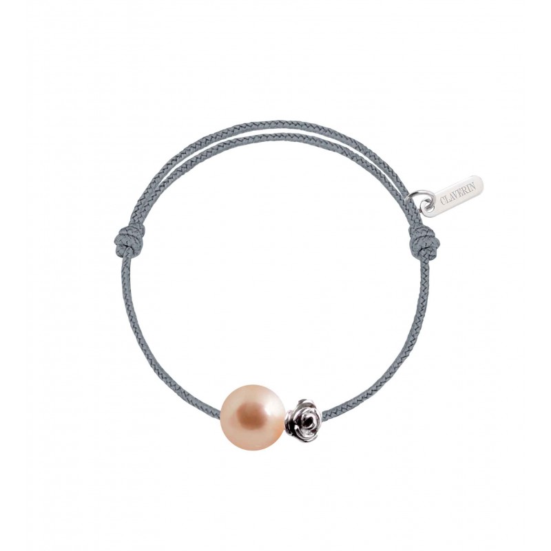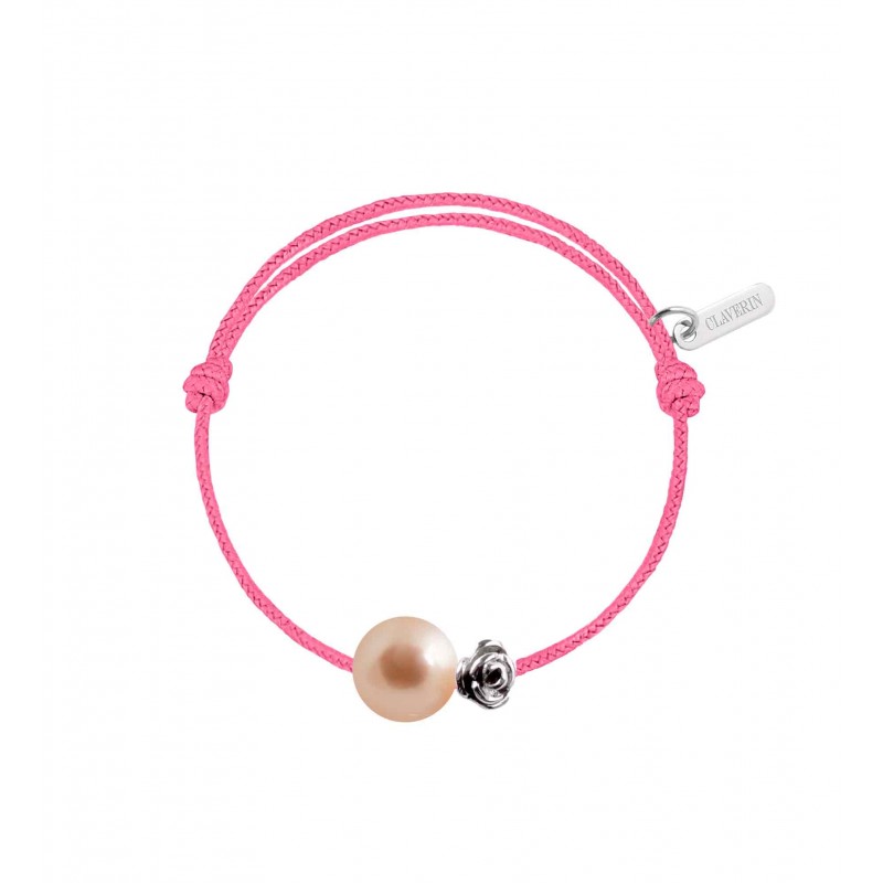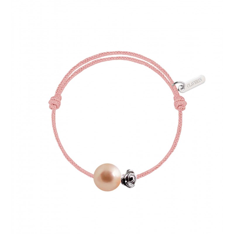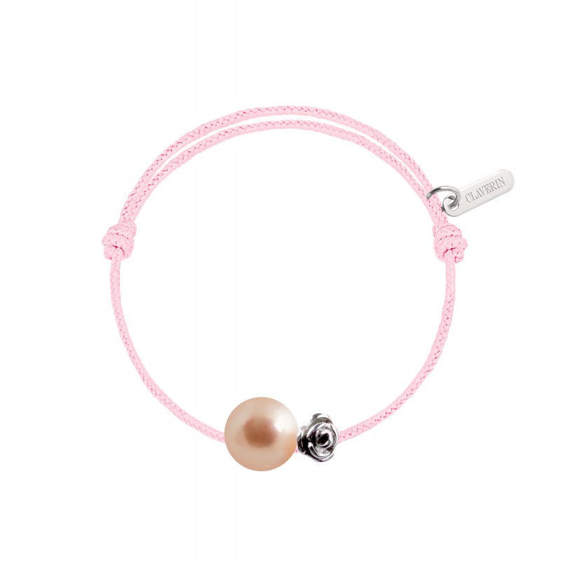 Perle de culture rose 7/8mm et fleur en or blanc 18 carats sur bracelet cordon (bébé ou enfant) ajustable au moyen de noeuds coulissants.