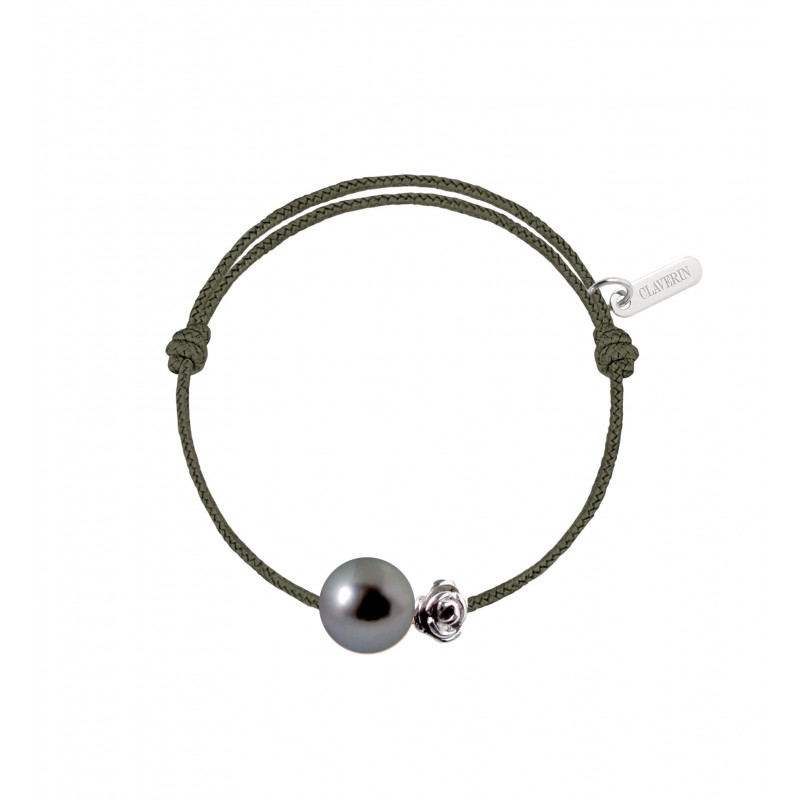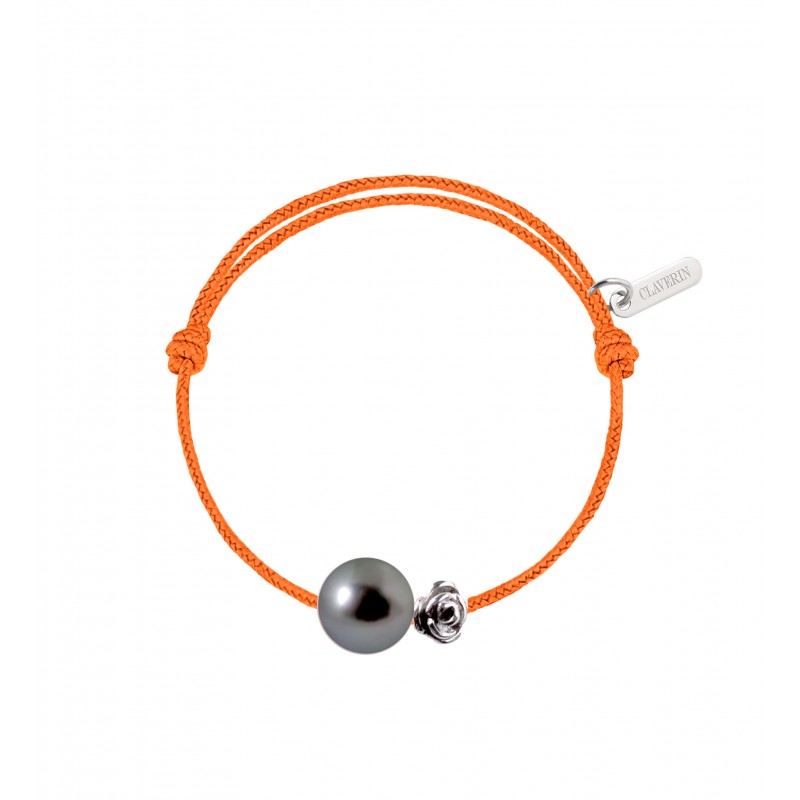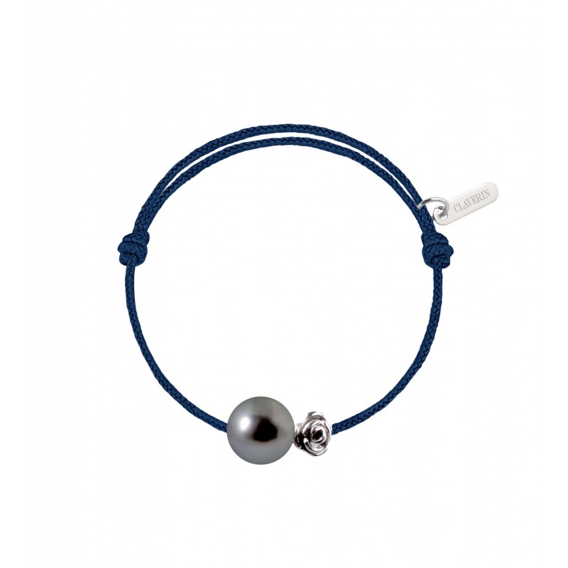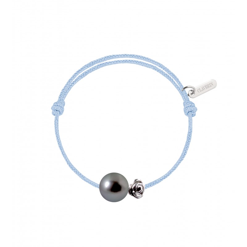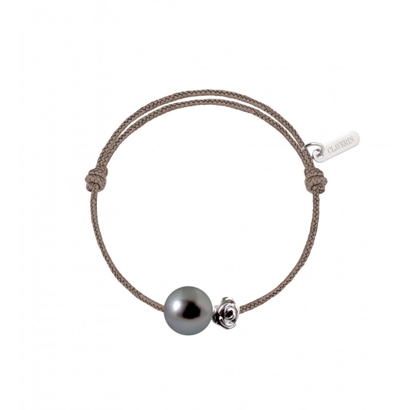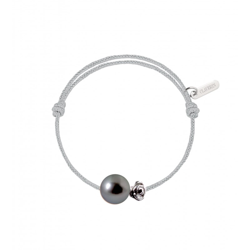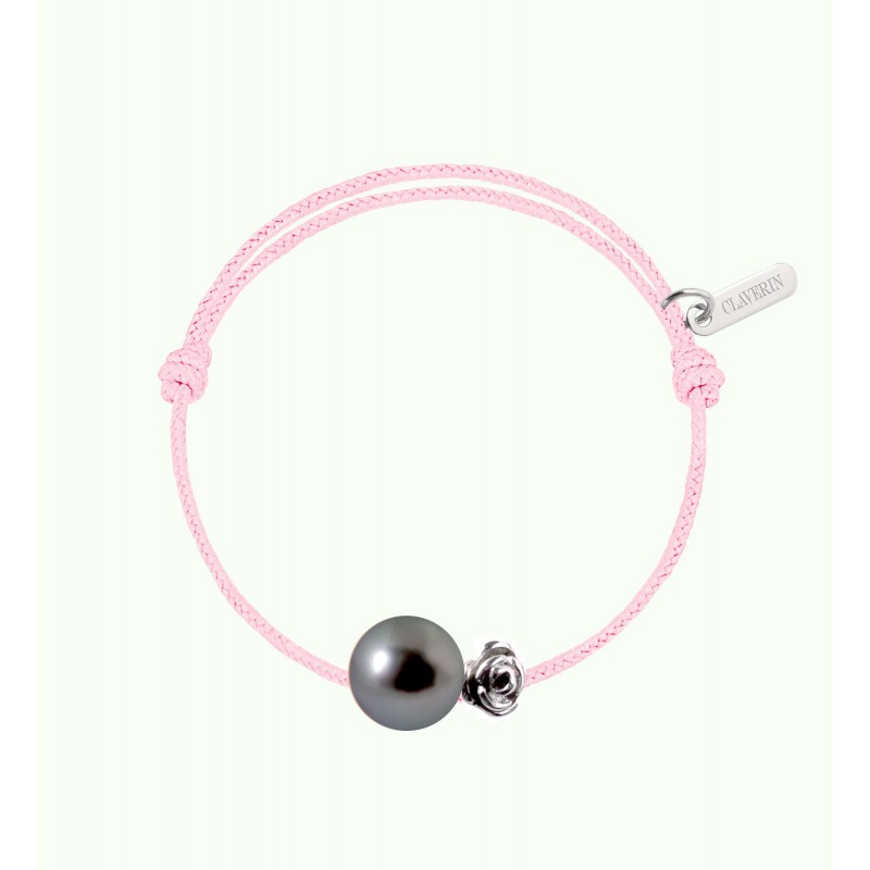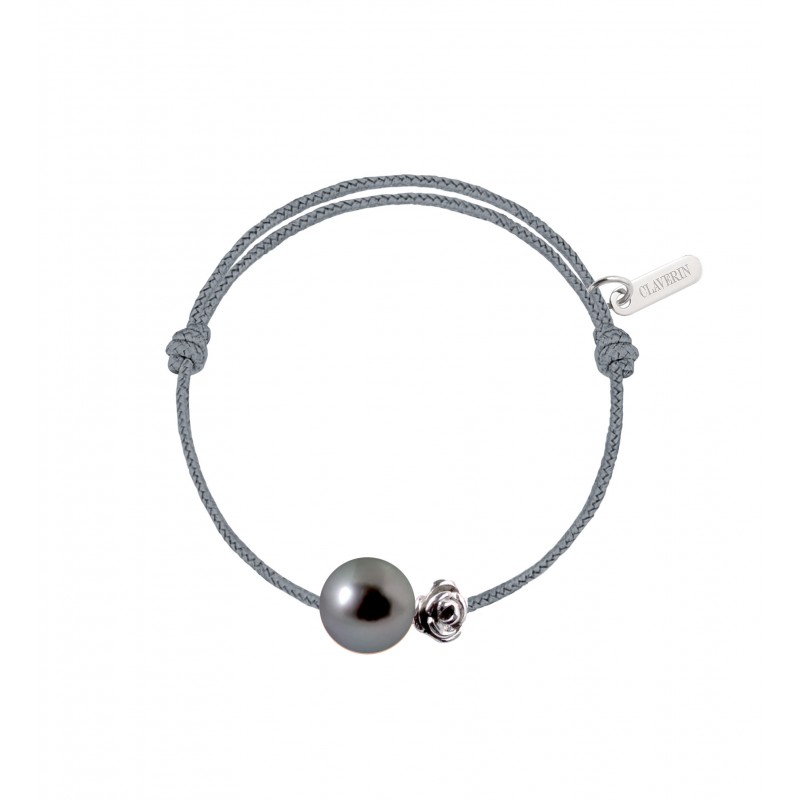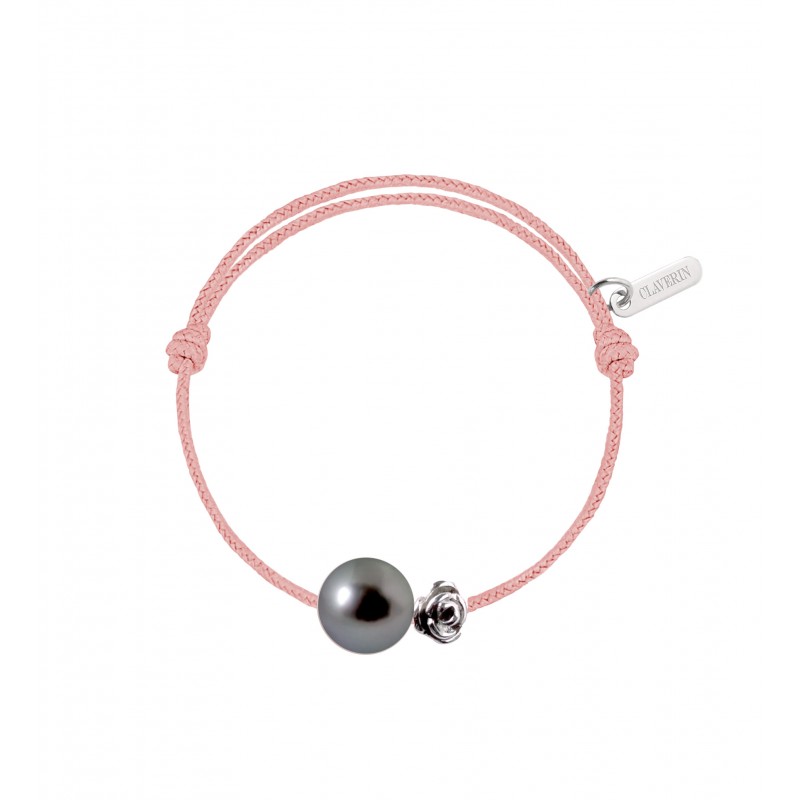 Perle noire de Tahiti 7/8mm et fleur en or blanc 18 carats sur bracelet cordon (bébé ou enfant) ajustable au moyen de noeuds coulissants.