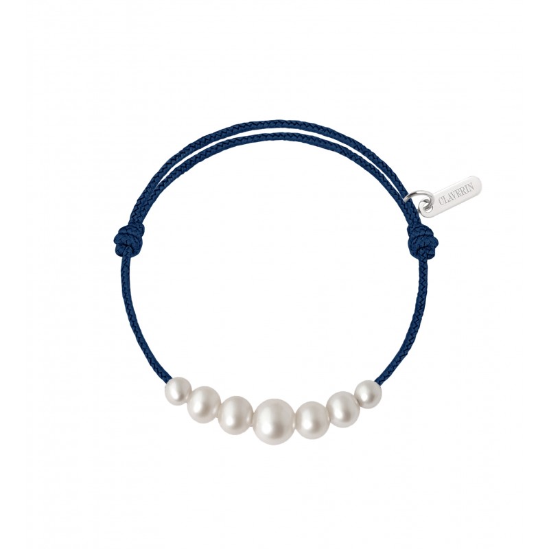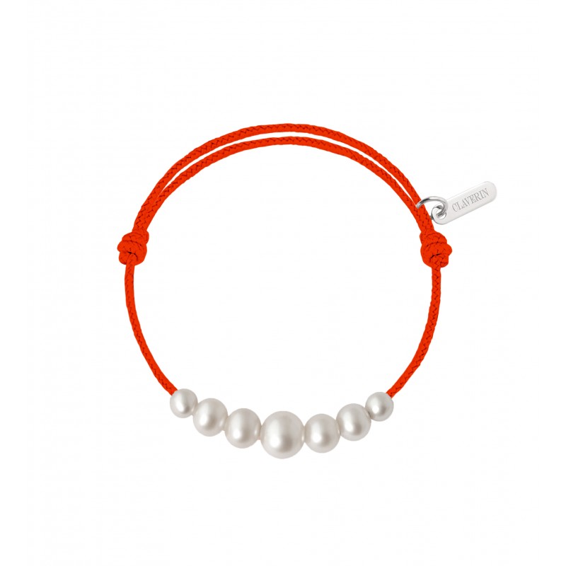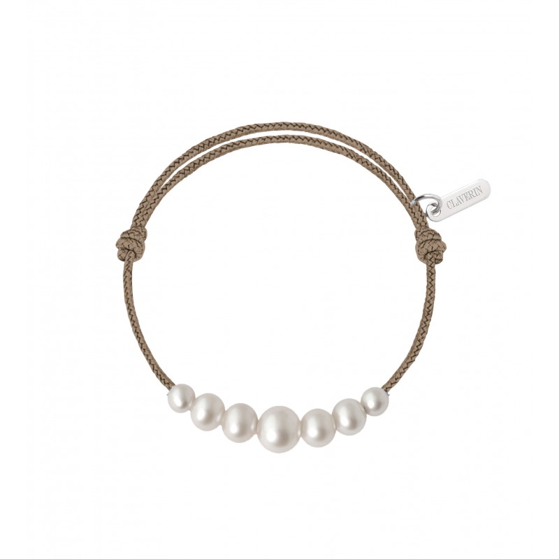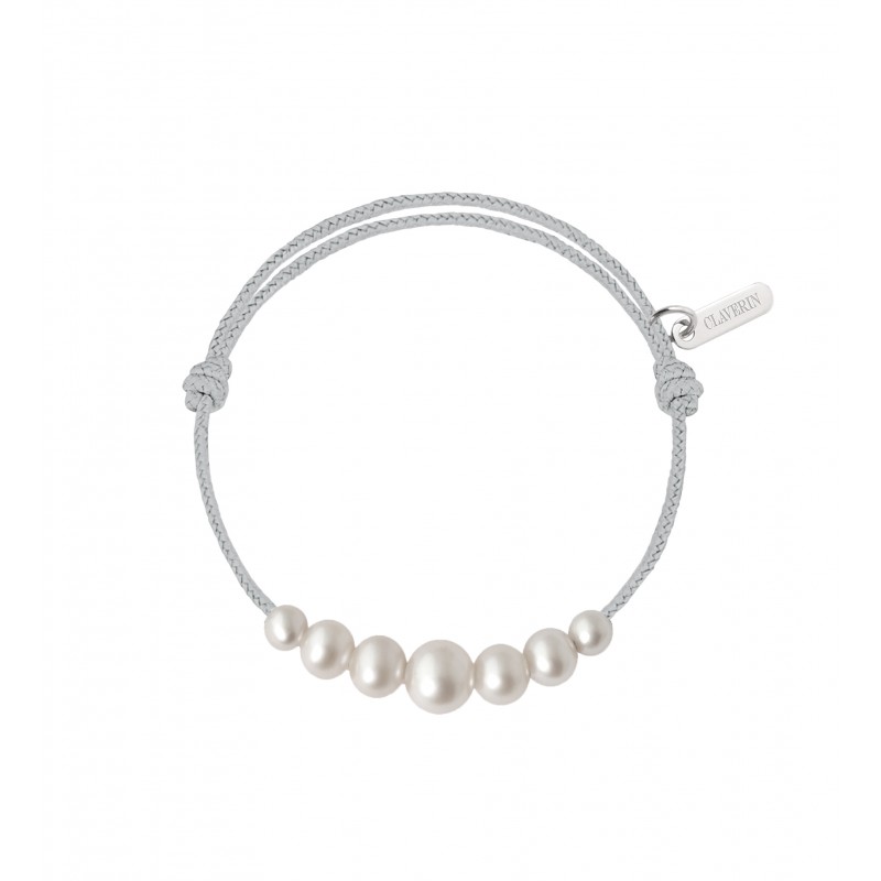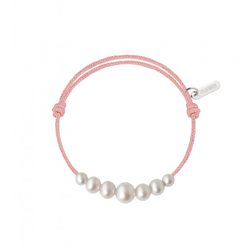 Bracelet cordon orné de 7 perles blanches en chute de 3 à 6 mm ; ajustable au moyen de noeuds coulissants.