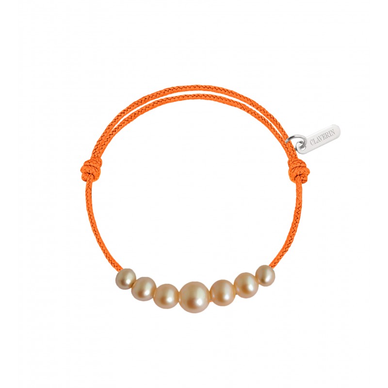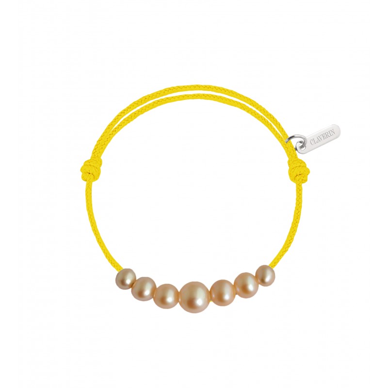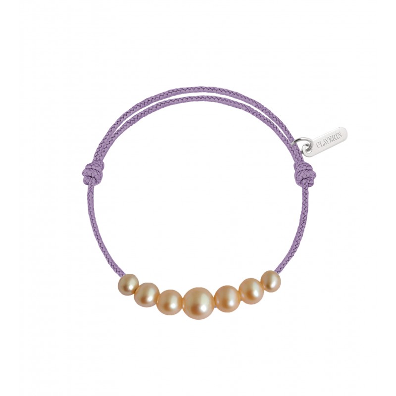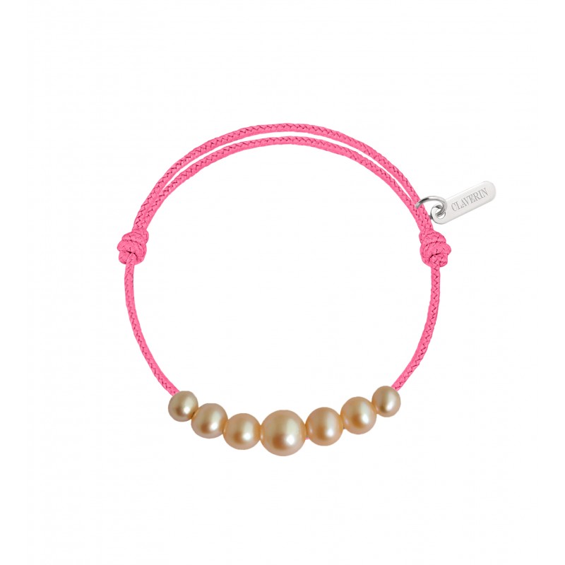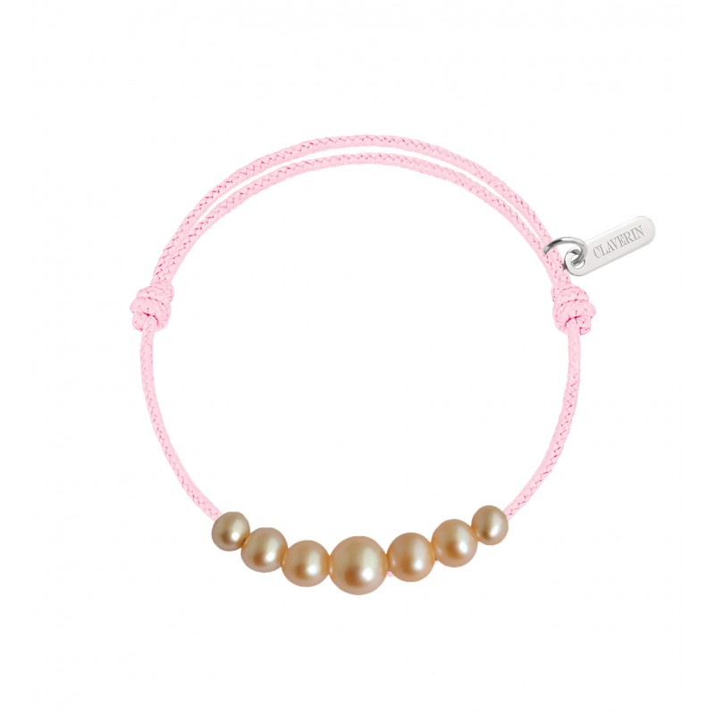 Bracelet cordon orné de 7 perles roses en chute de 3 à 6 mm ; ajustable au moyen de noeuds coulissants.