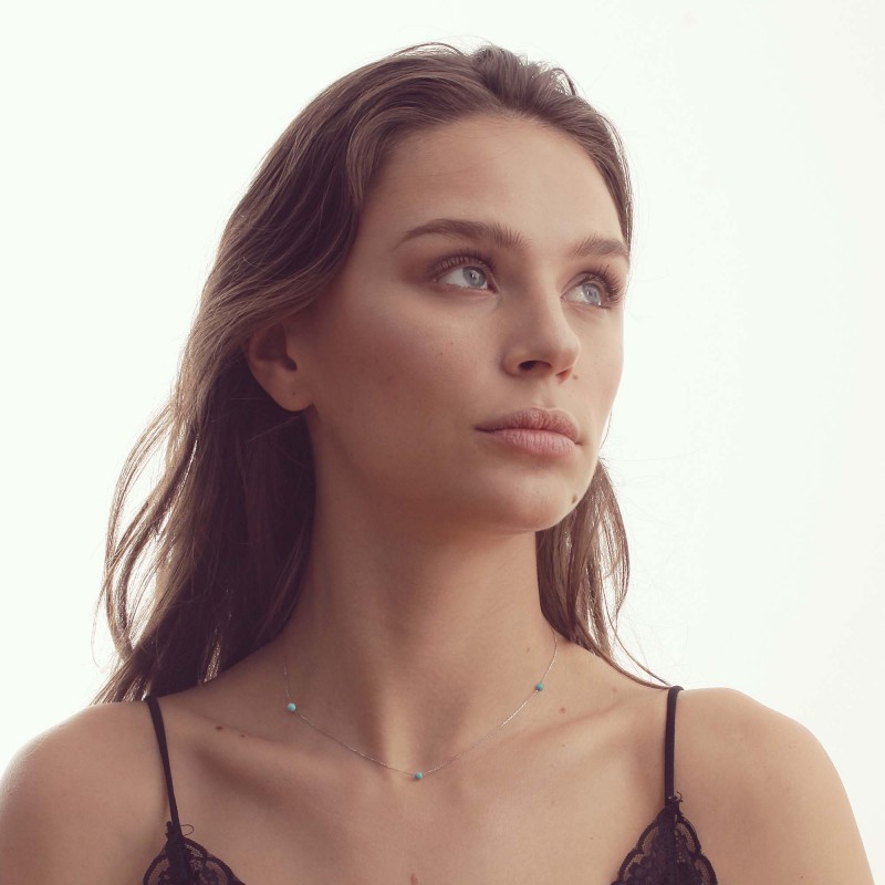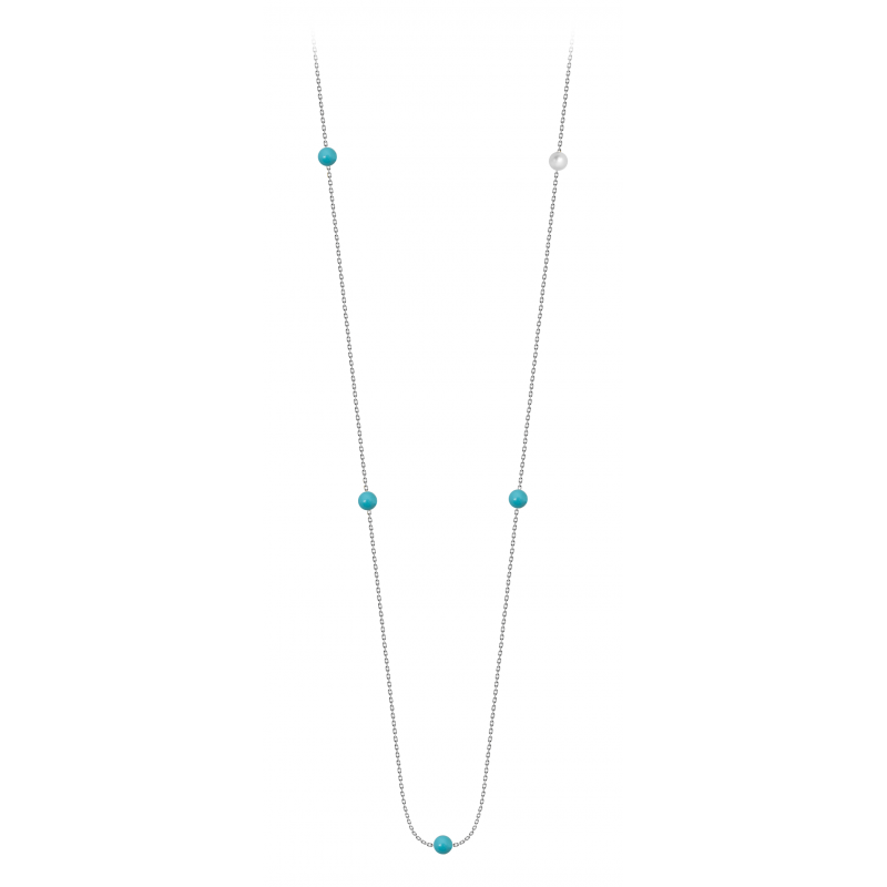Collier Give me 5, 4 perles de turquoise 3/4 mm associées à une perle blanche 3/4 mm, symétriques sur chaine en or blanc 18 carats d'une longueur de 38, 40 ou 42 cm avec les contre-anneaux.