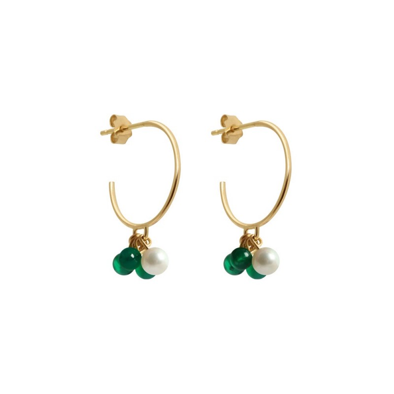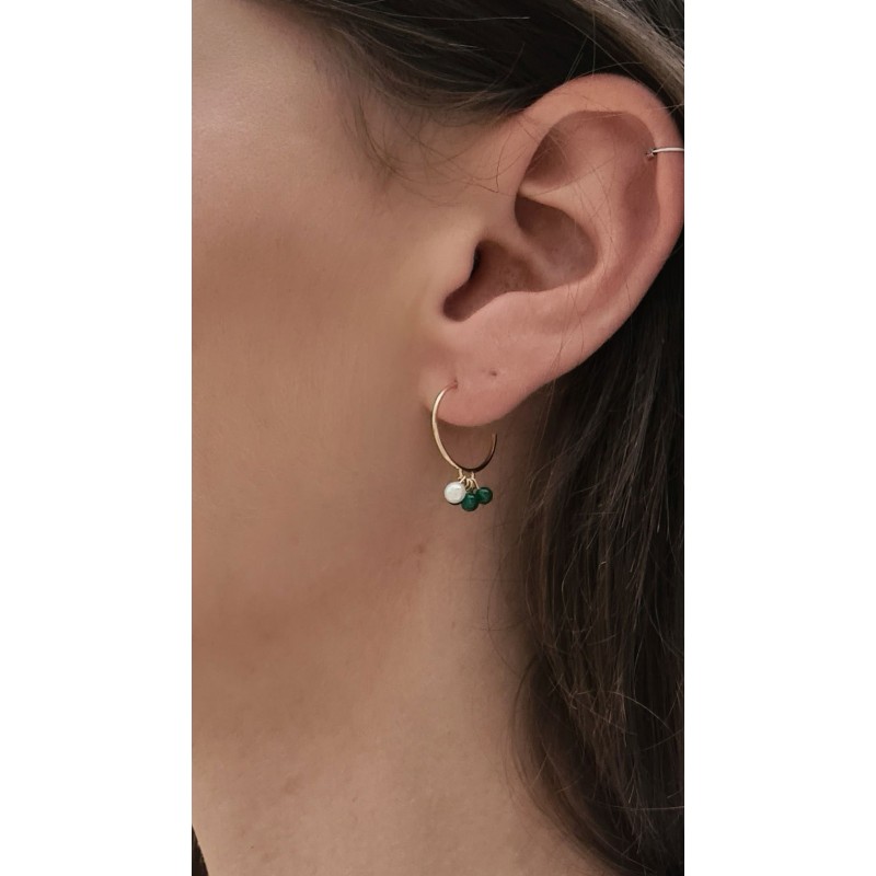 Boucles d'oreilles créoles diamètre 14 mm, ouvertes en or jaune 18 carats ornées comme un bouquet de 4 perles d'agate verte 3mm et d'une perle blanche 3,5/4mm.