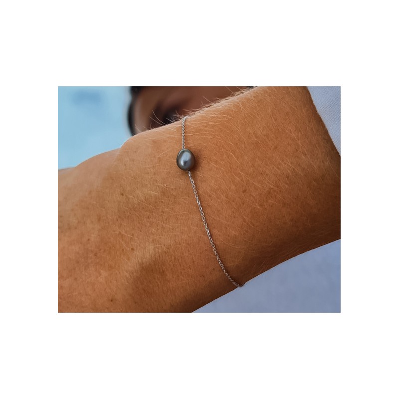 Bracelet perle keishi (5 mm) sur chaîne fine en or blanc 18 carats d'une longueur de 17,5 cm avec deux contre-anneaux à 15,5 et 16,5 cm