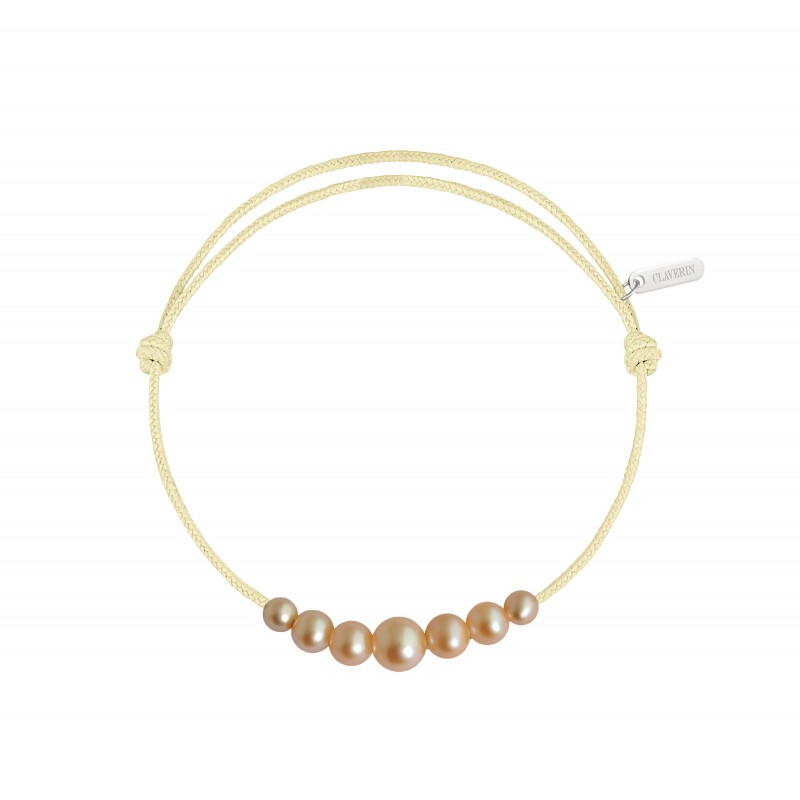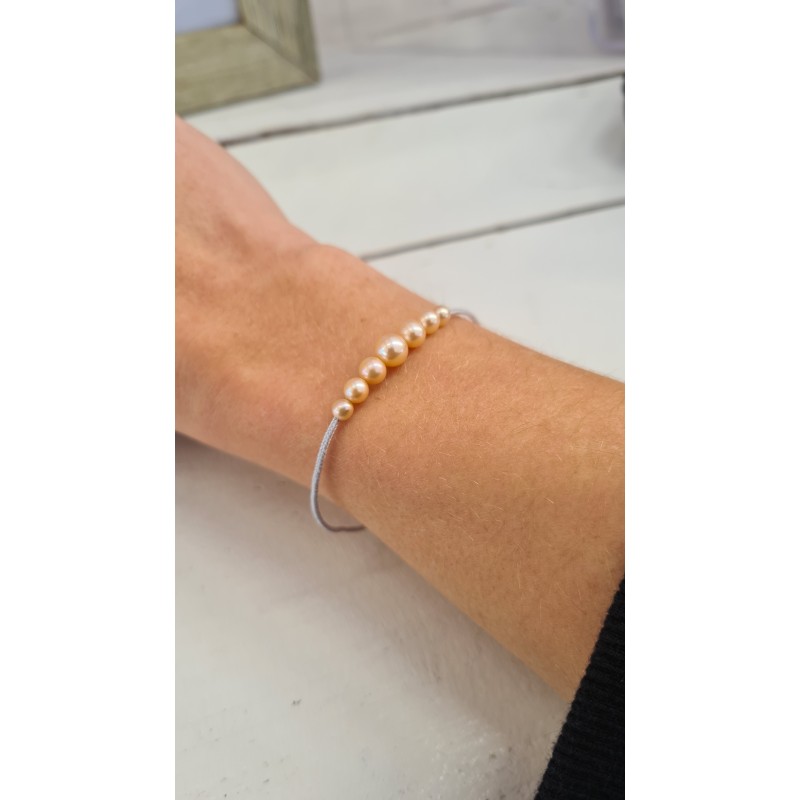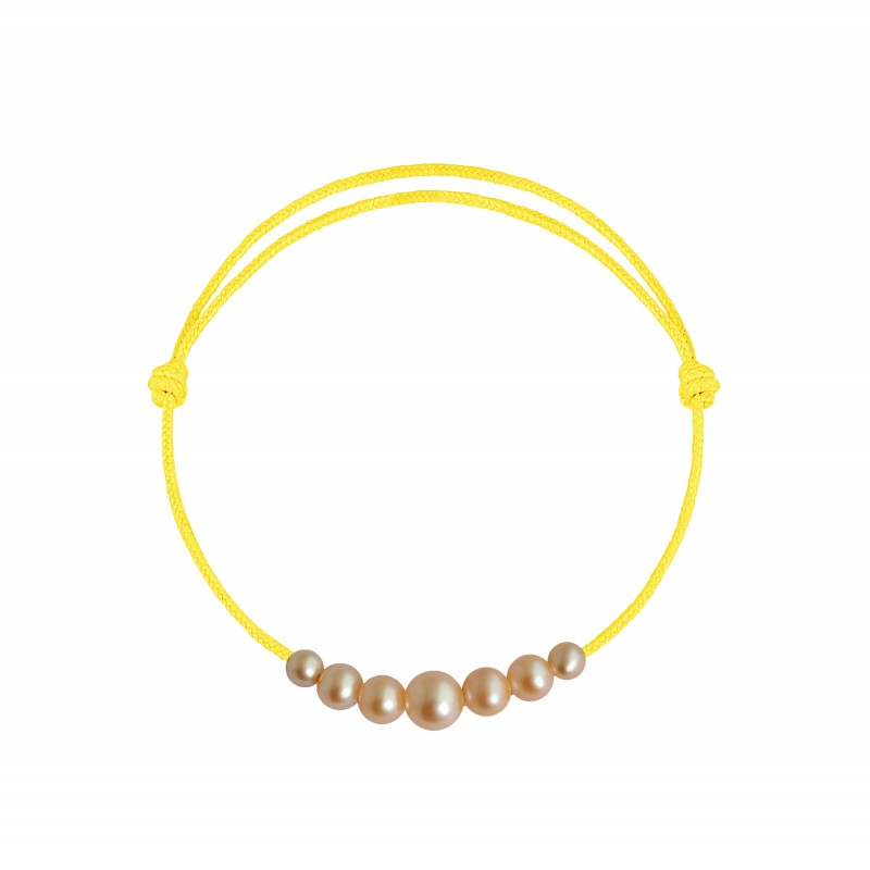 Bracelet cordon orné de 7 perles roses en chute de 3 à 6 mm ; ajustable au moyen de noeuds coulissants.