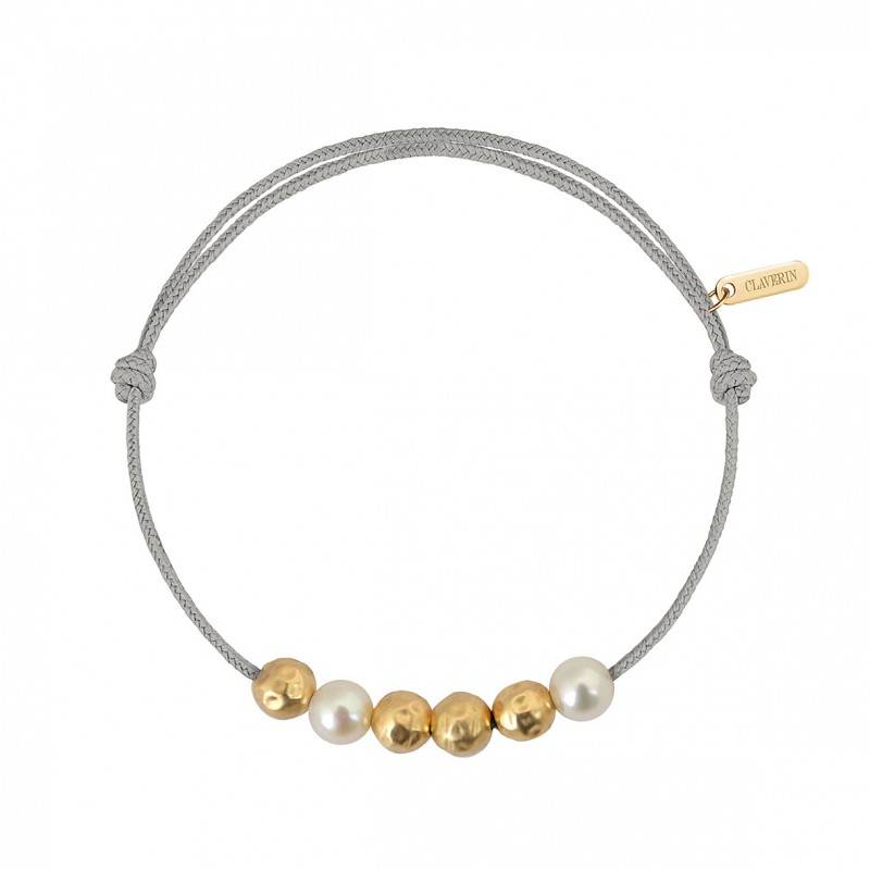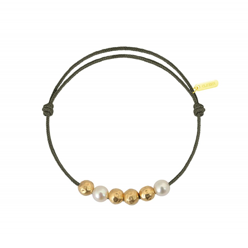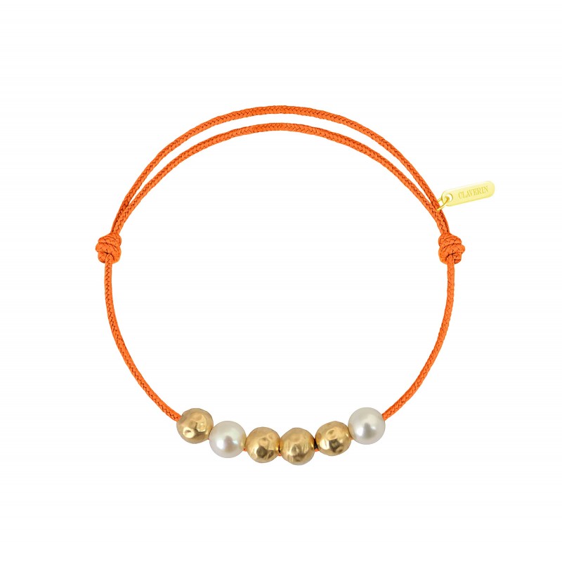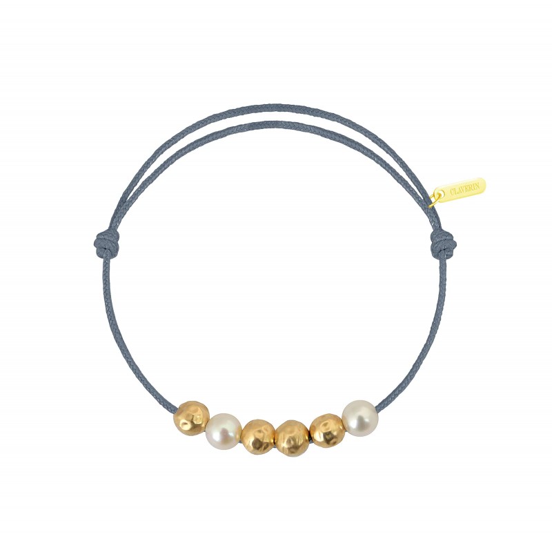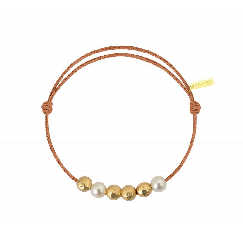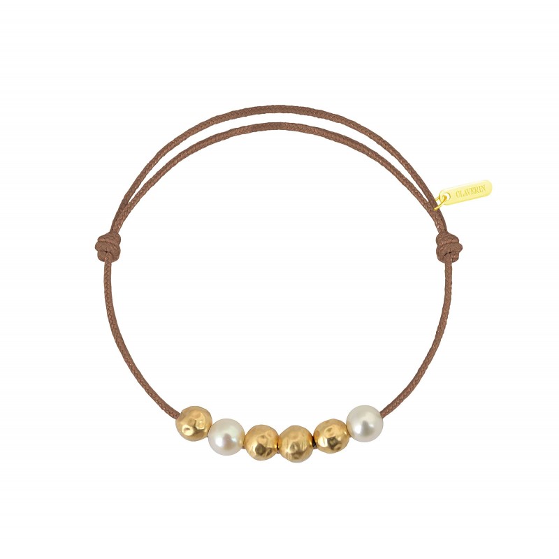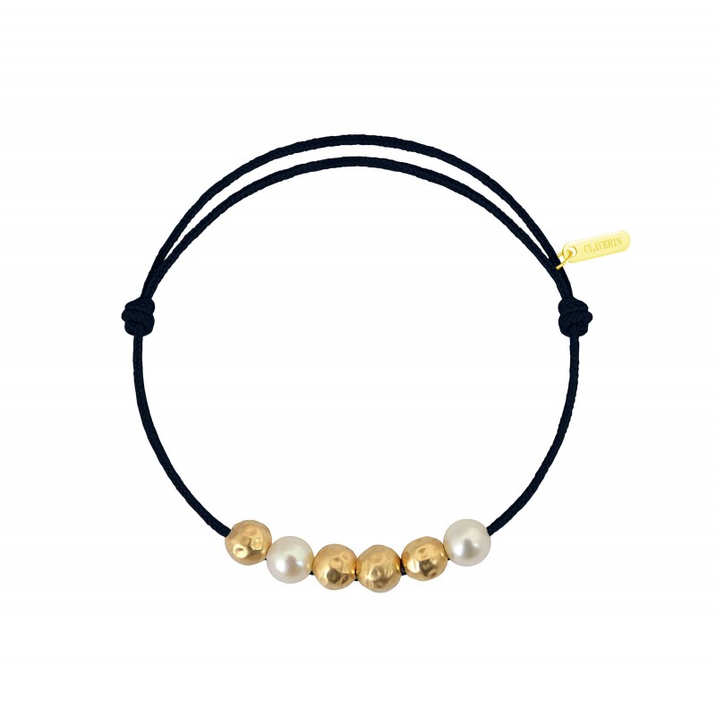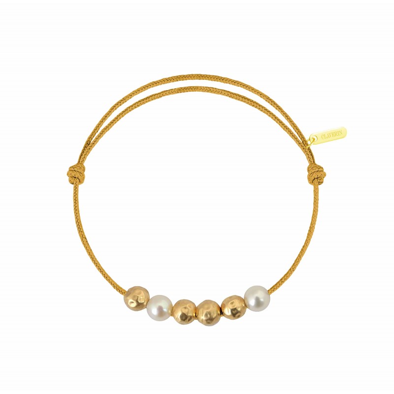 Boules en or jaune 18 carats martelées à la main et perles de culture blanches 5mm, plaquette Claverin en or sur bracelet cordon ajustable au moyen de noeuds coulissants, 27 couleurs de cordons disponibles