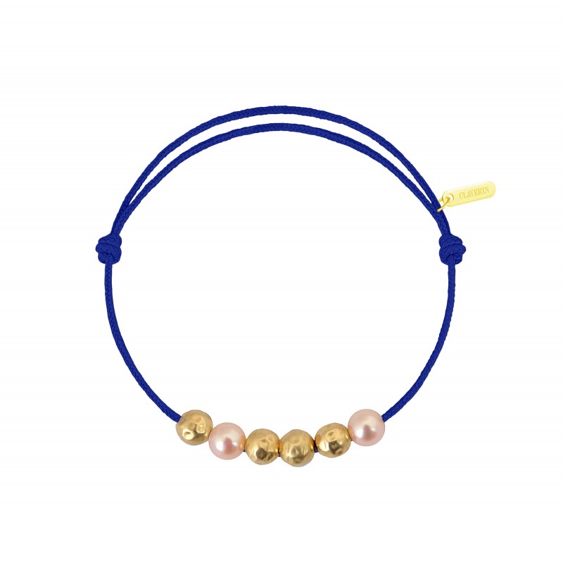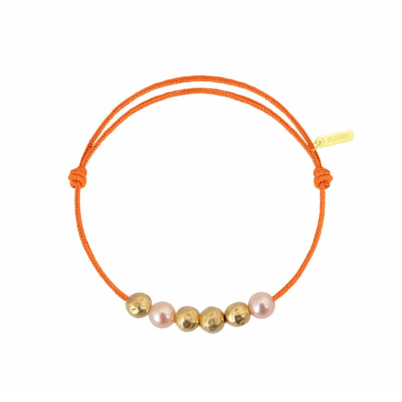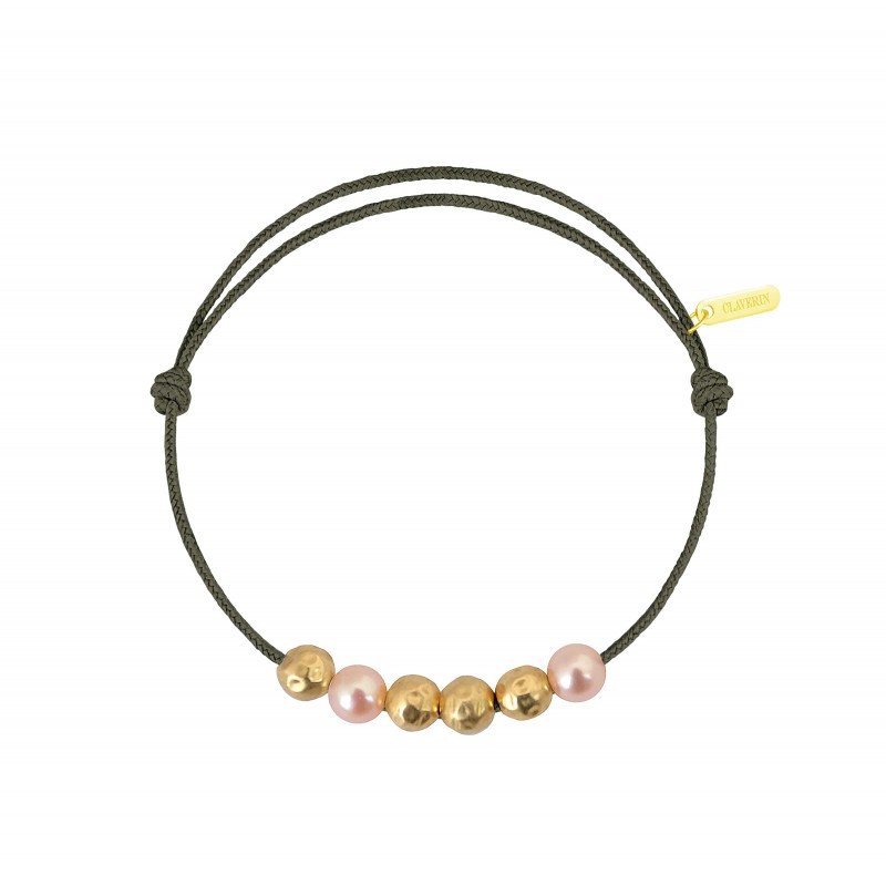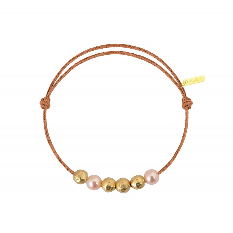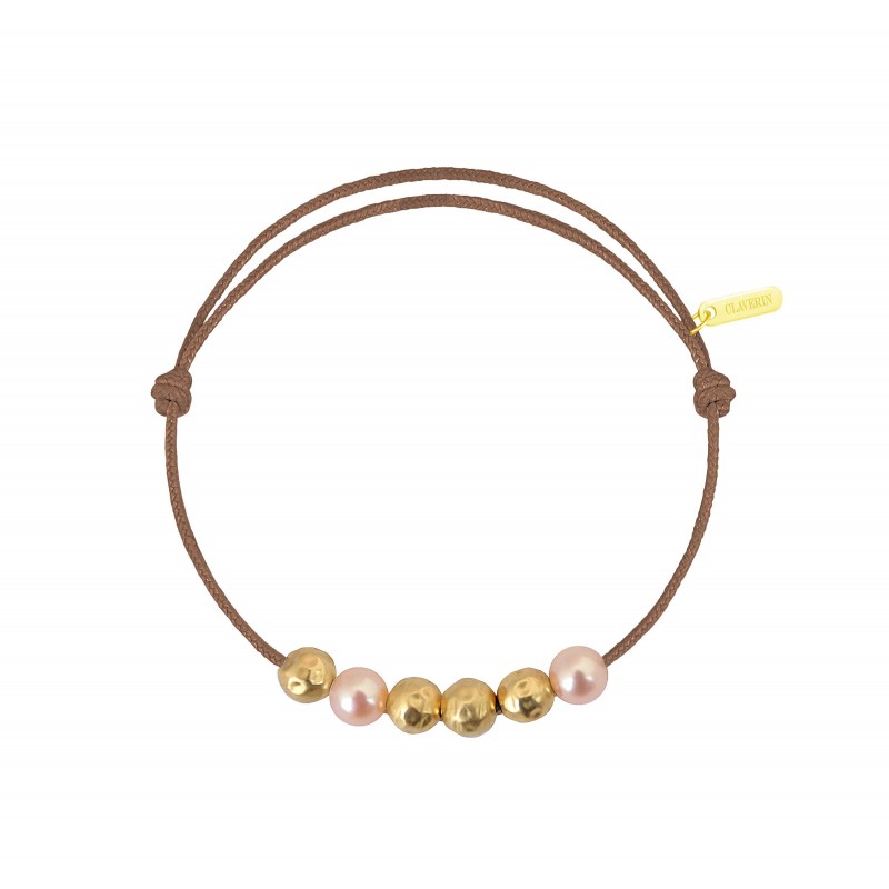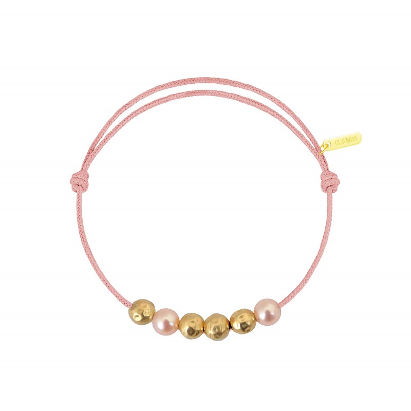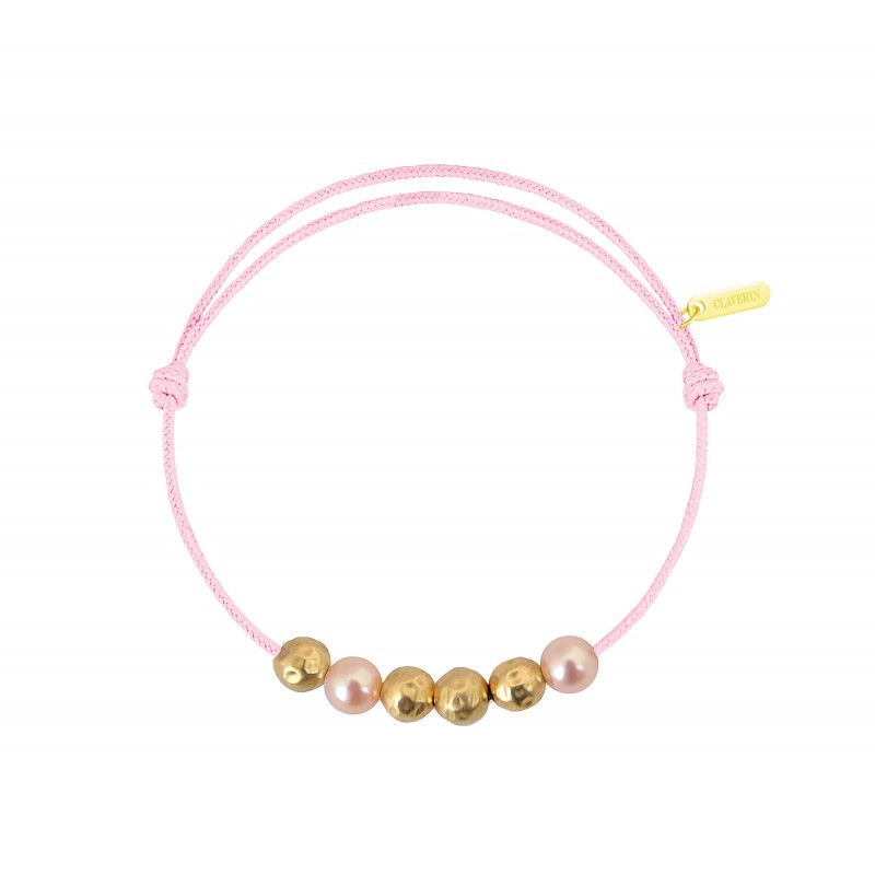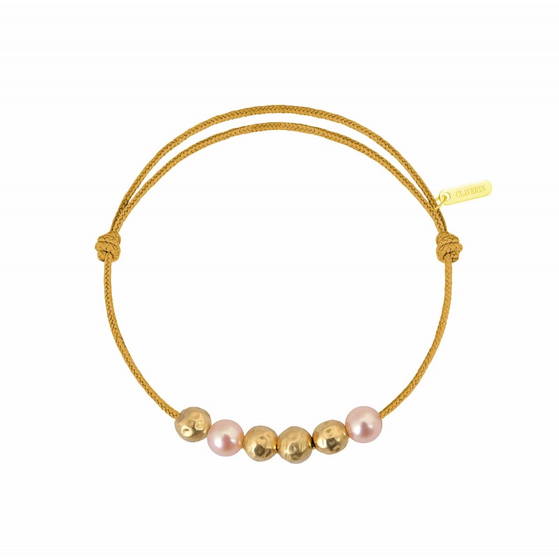 Boules en or jaune 18 carats martelées à la main et perles de culture roses 5 mm, plaquette Claverin en or sur bracelet cordon ajustable au moyen de noeuds coulissants, 27 couleurs de cordons disponibles
