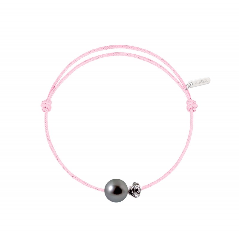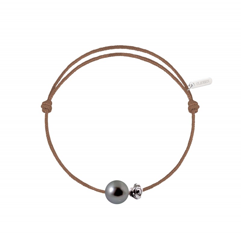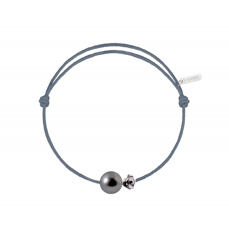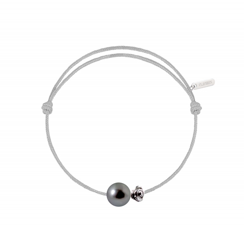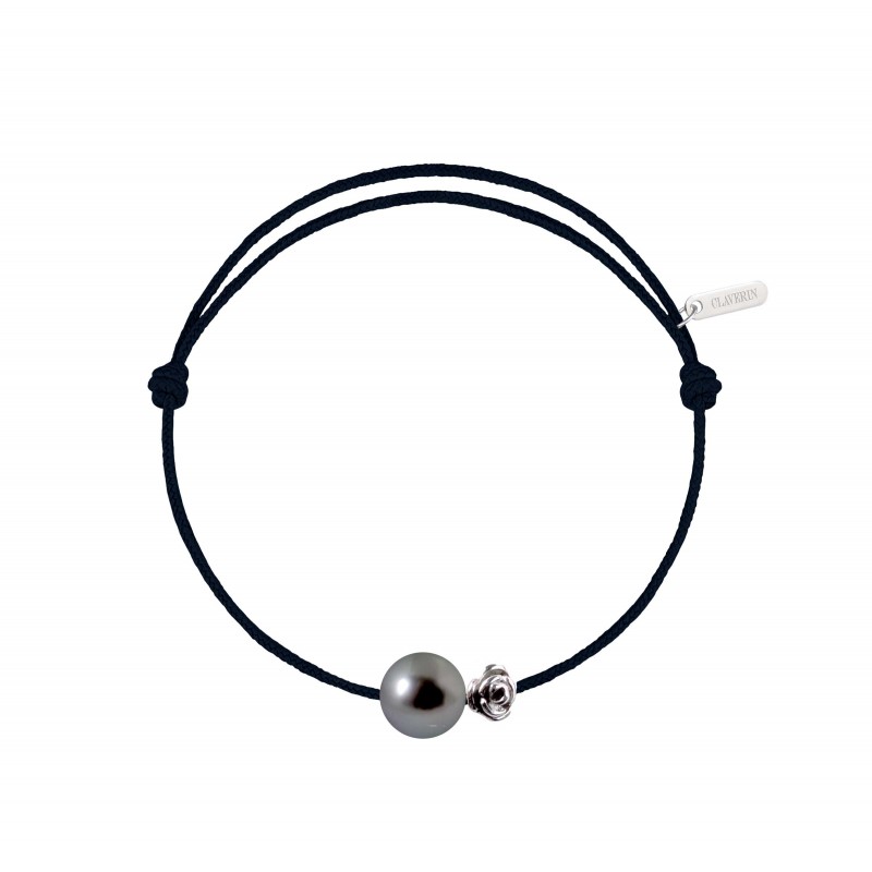 Bracelet cordon, ajustable au moyen de noeuds coulissant avec une perle noire de Tahiti 7/8mm et une fleur en or blanc 18 carats.