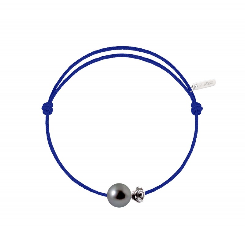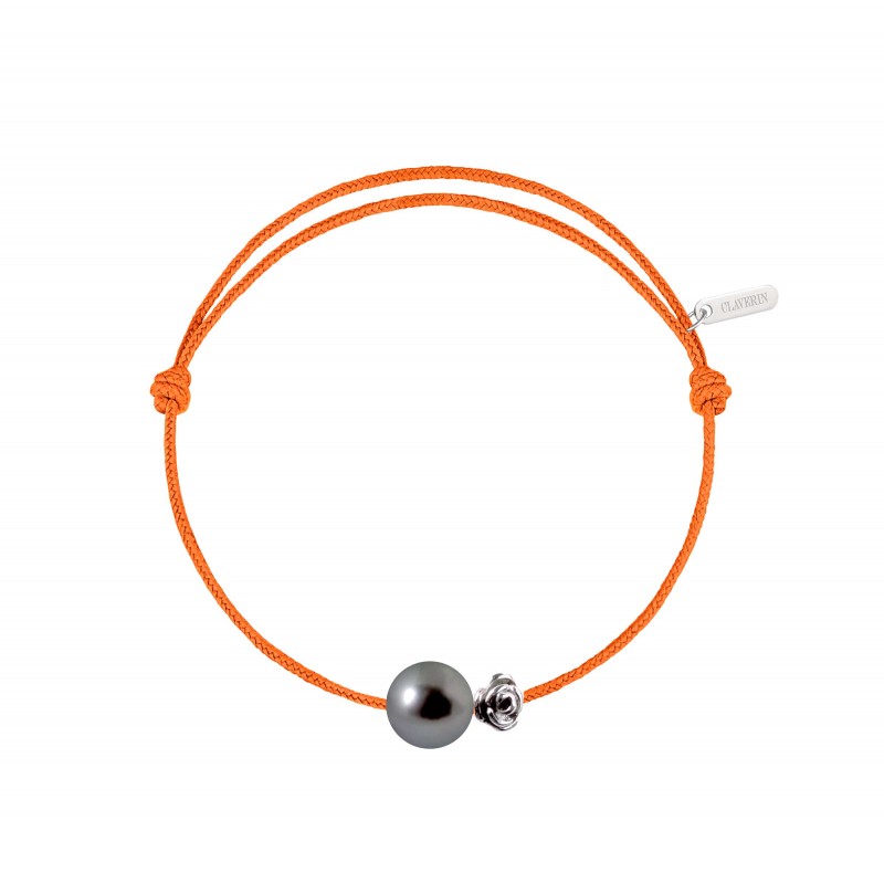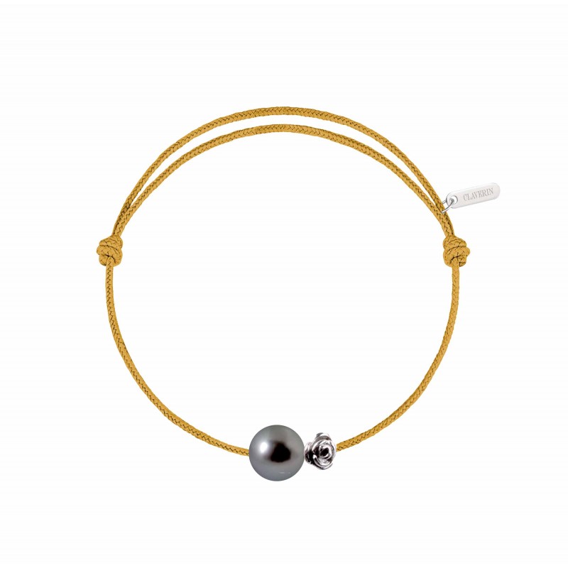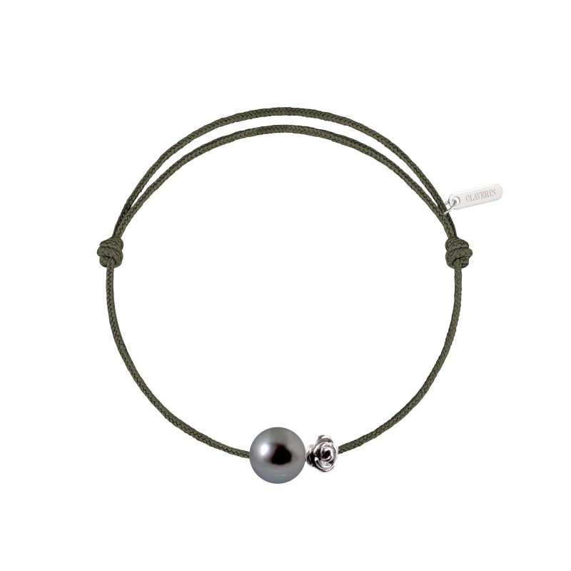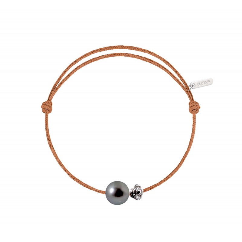 Bracelet cordon, ajustable au moyen de noeuds coulissant avec une perle noire de Tahiti 7/8mm et une fleur en or blanc 18 carats.