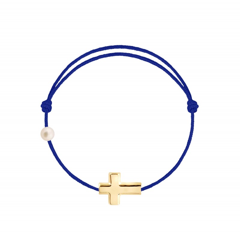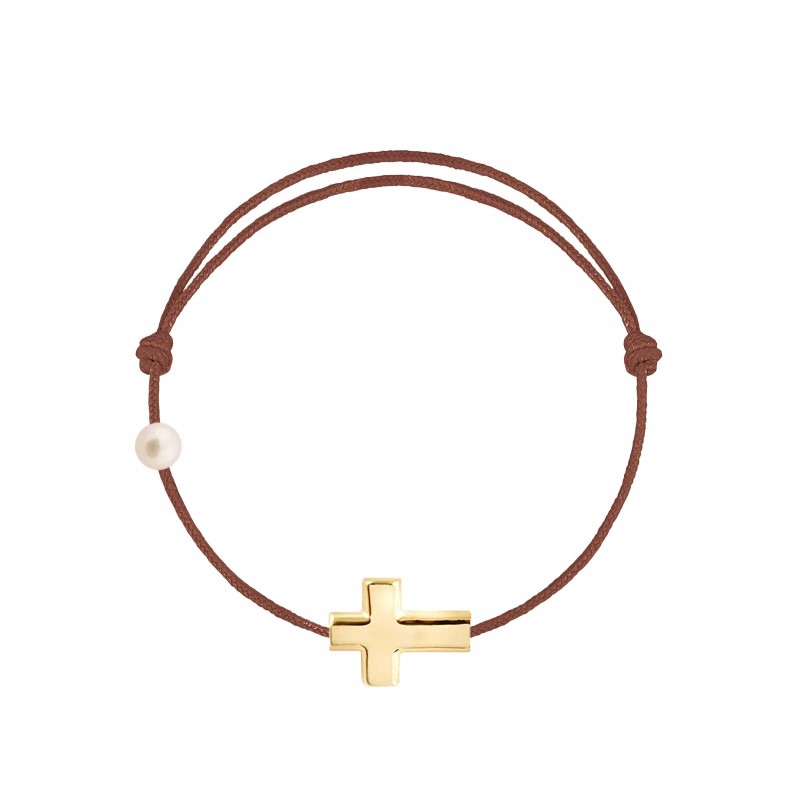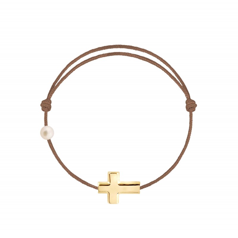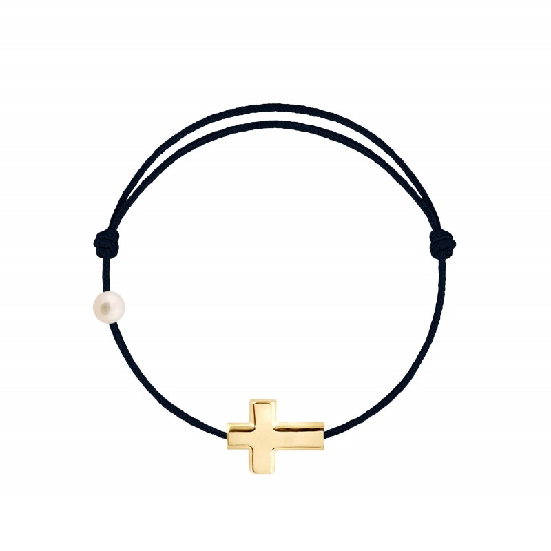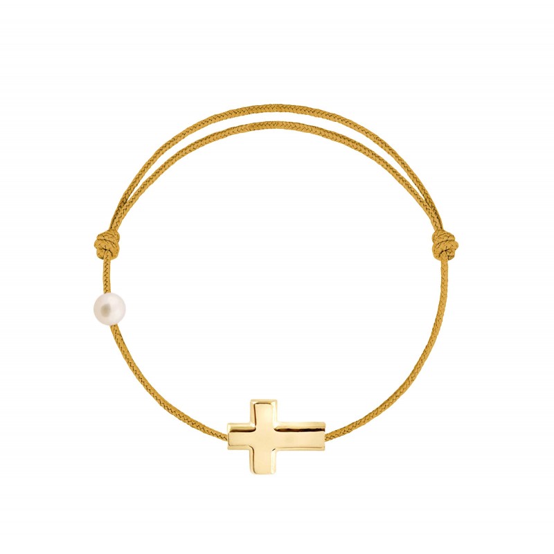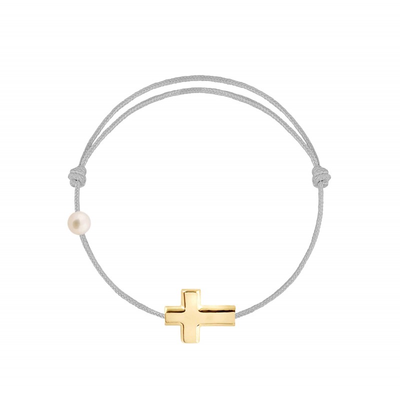 Croix en or jaune 18 carats, gravé Claverin au verso, et perle de culture blanche 3 mm sur bracelet cordon, ajustable au moyen de noeuds coulissants.