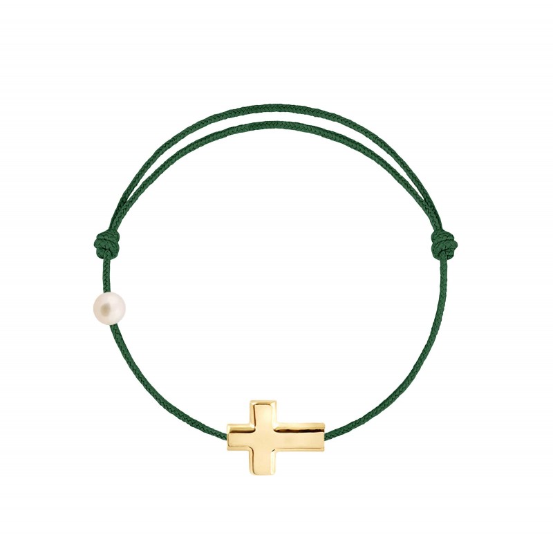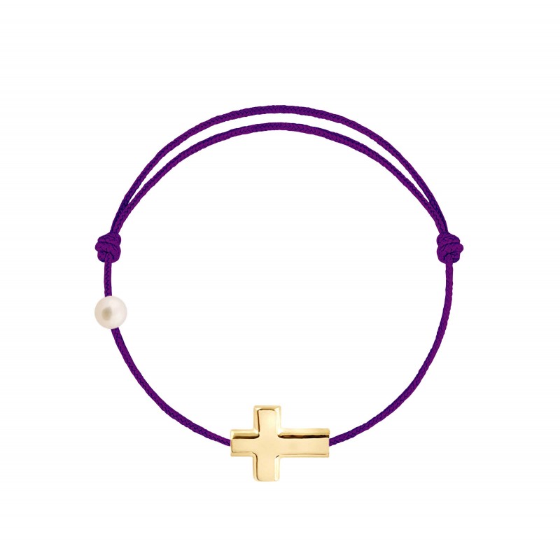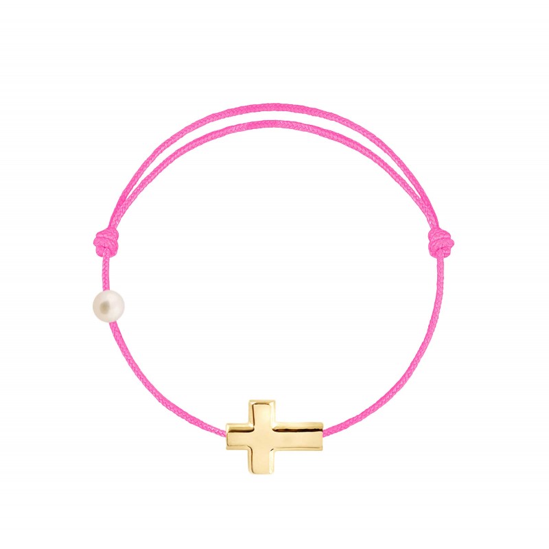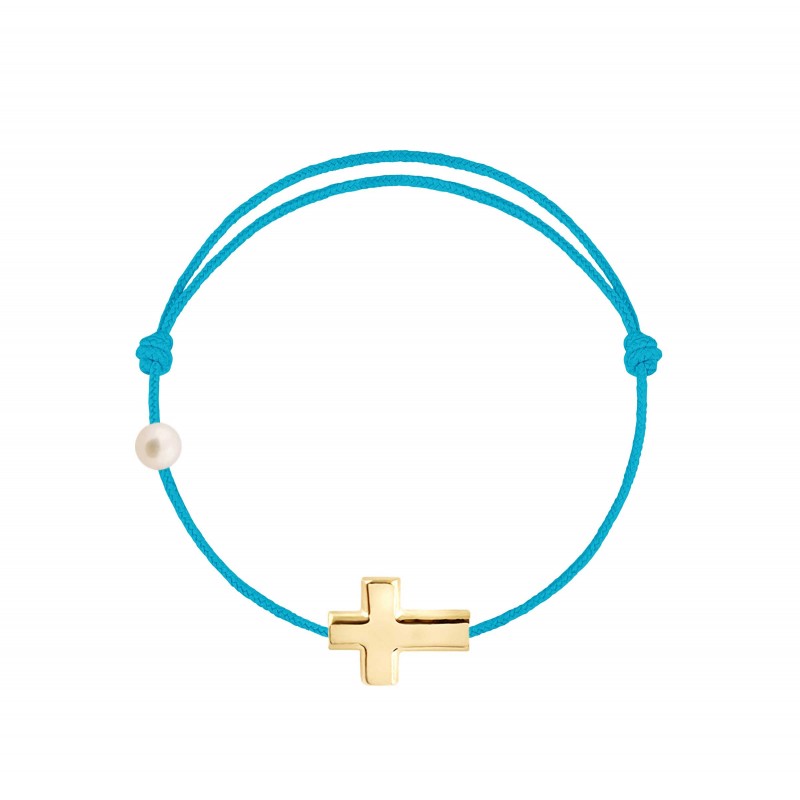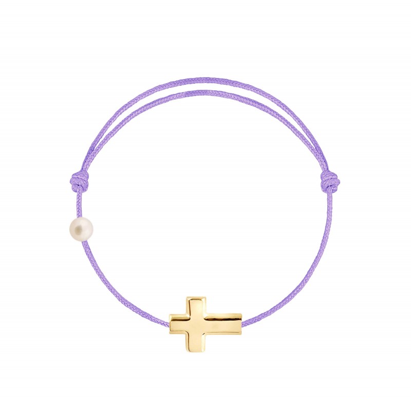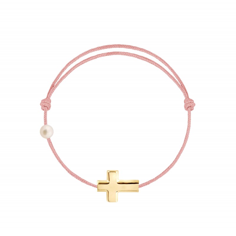Croix en or jaune 18 carats, gravé Claverin au verso, et perle de culture blanche 3 mm sur bracelet cordon, ajustable au moyen de noeuds coulissants.