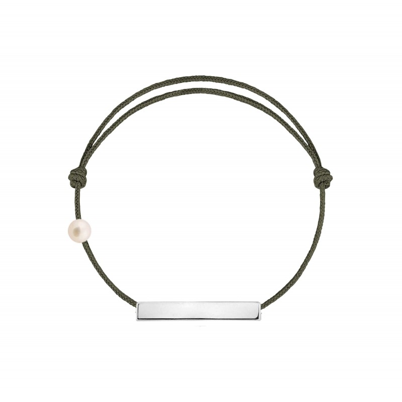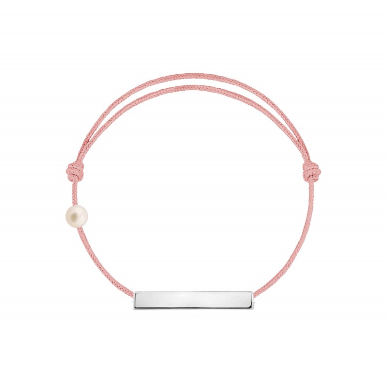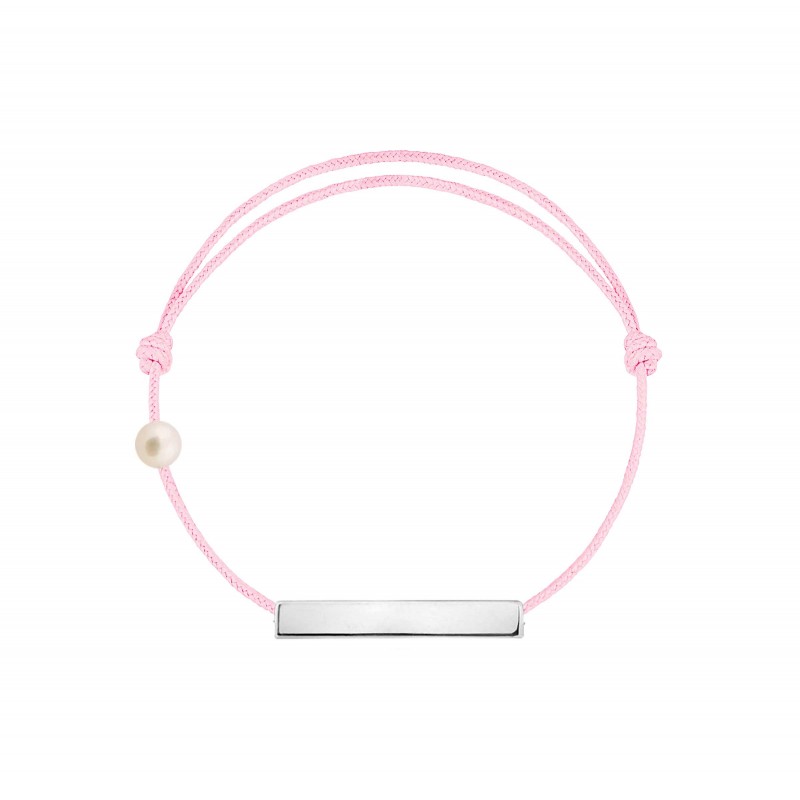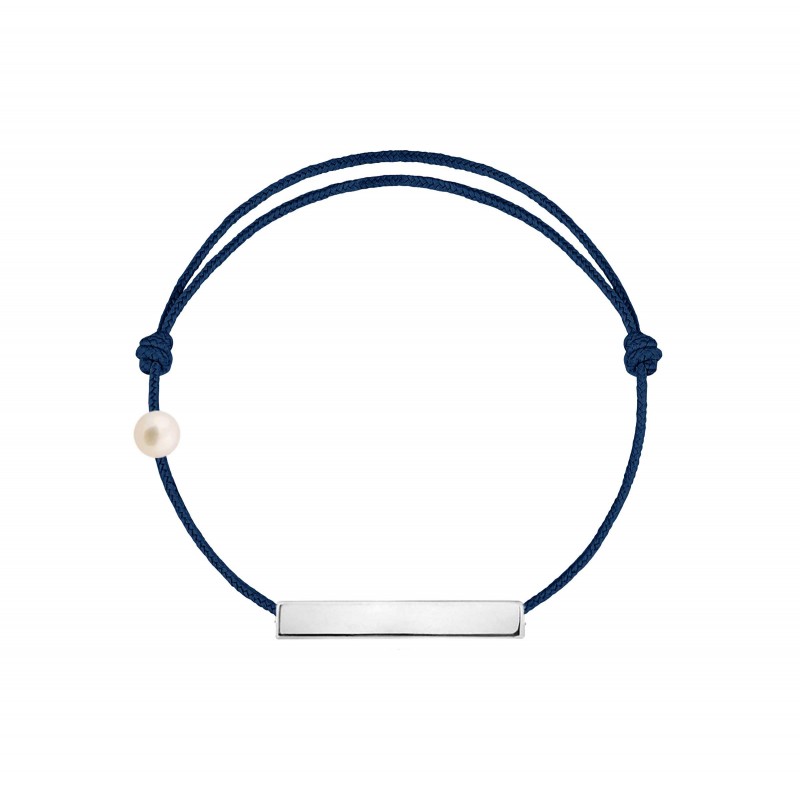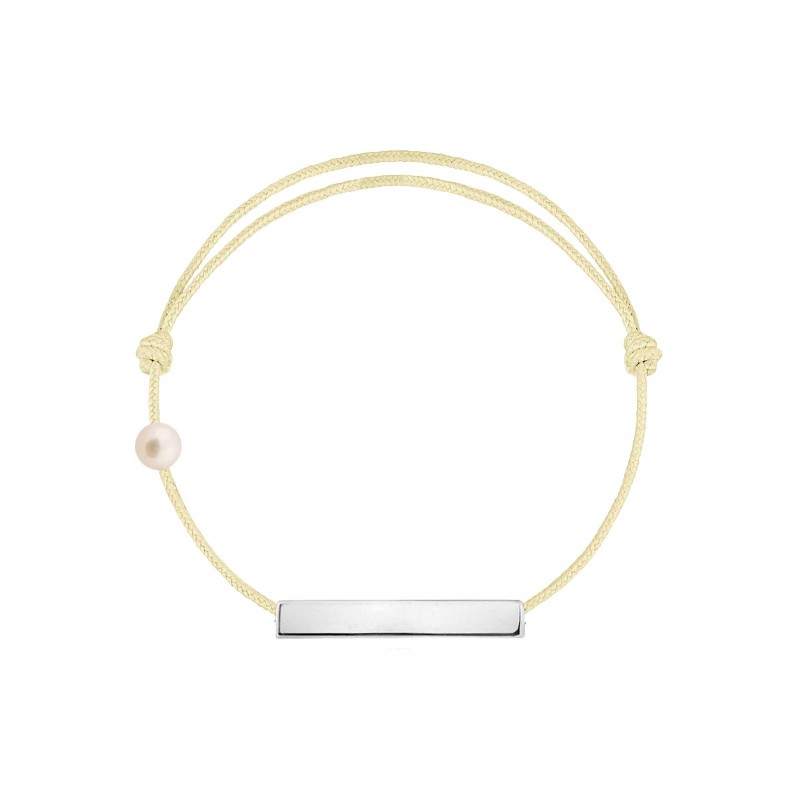 Plaque en or blanc 18 carats, gravée Claverin au verso, et perle de culture blanche 3 mm sur bracelet cordon, ajustable au moyen de noeuds coulissants.