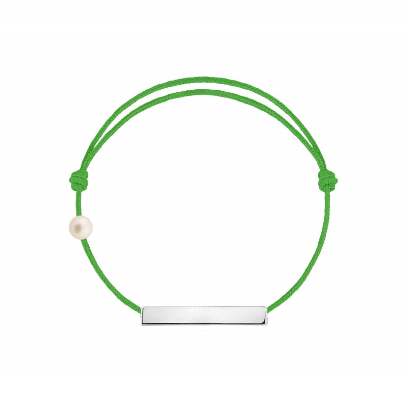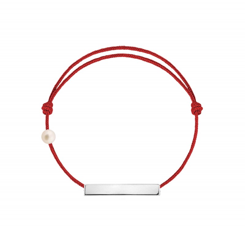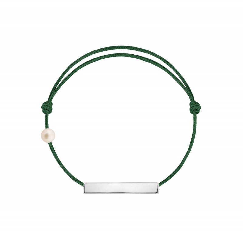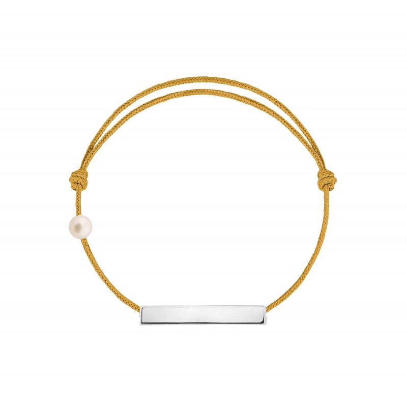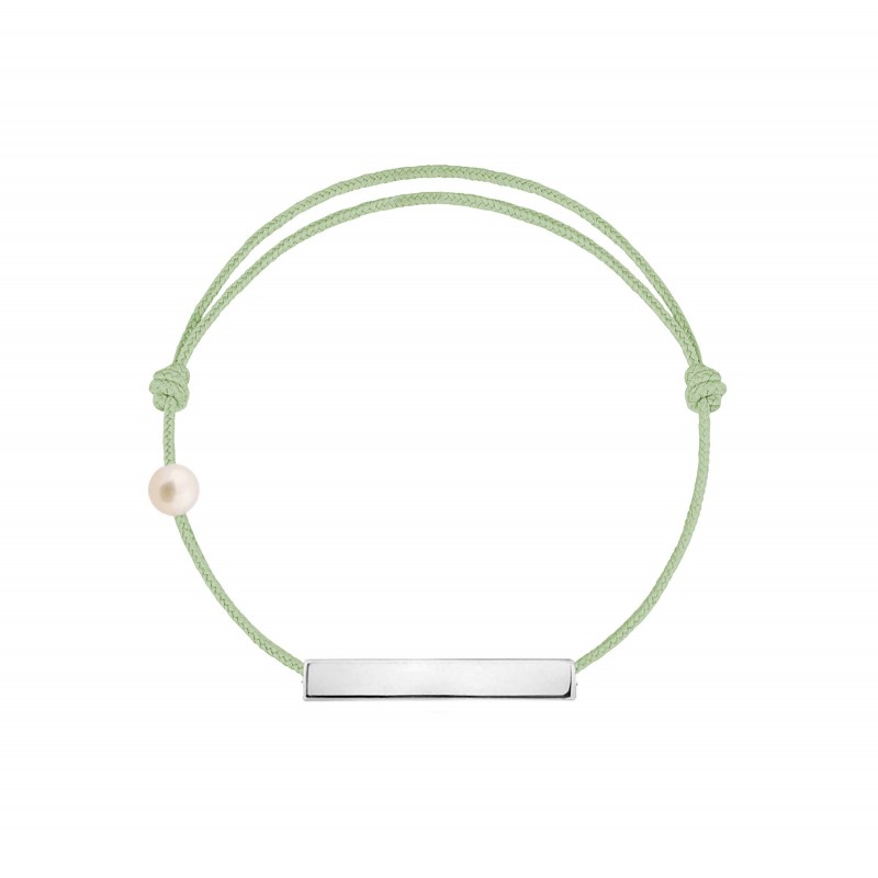 Plaque en or blanc 18 carats, gravée Claverin au verso, et perle de culture blanche 3 mm sur bracelet cordon, ajustable au moyen de noeuds coulissants.