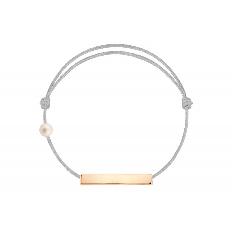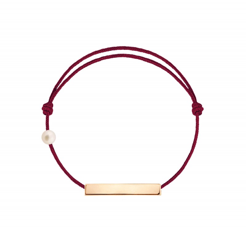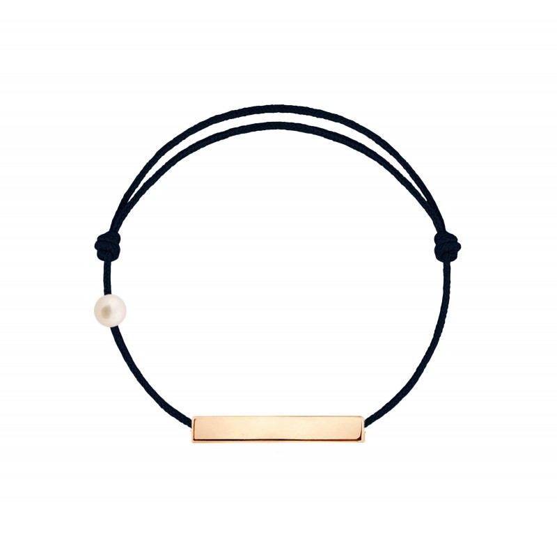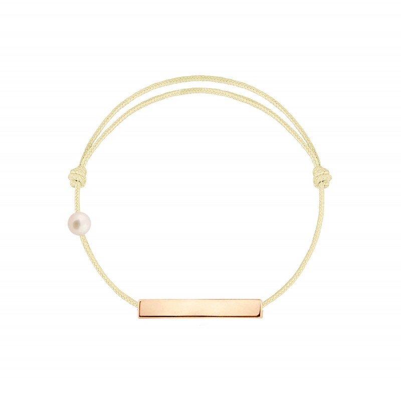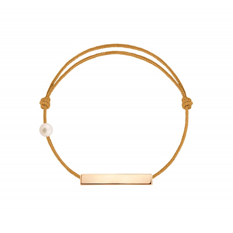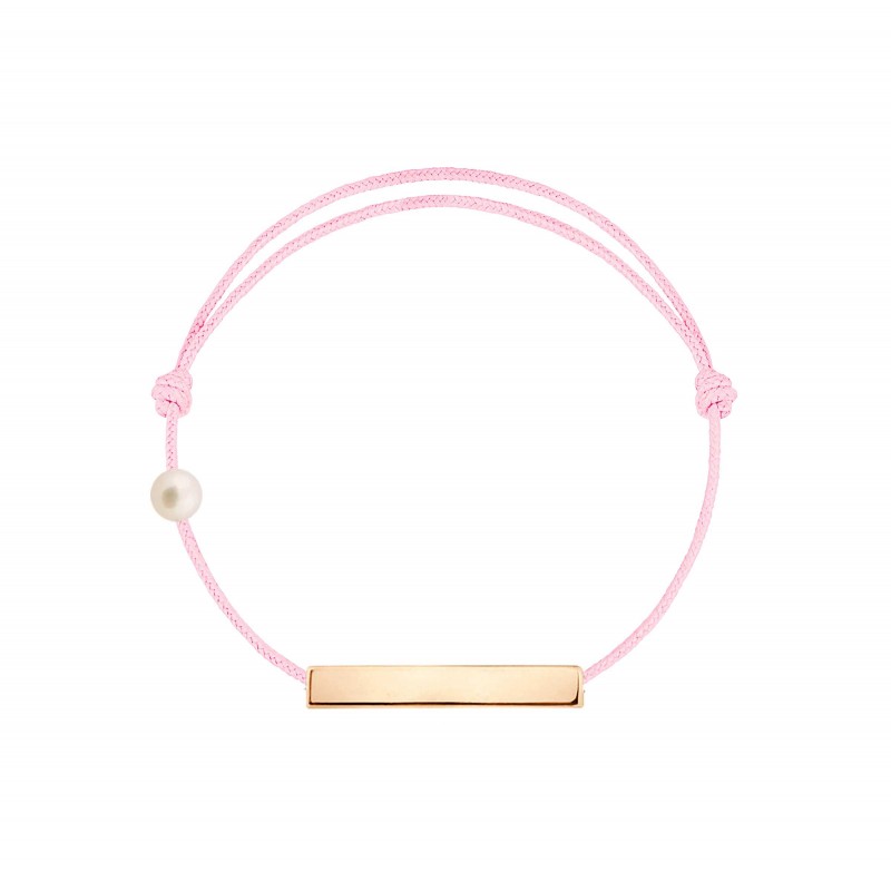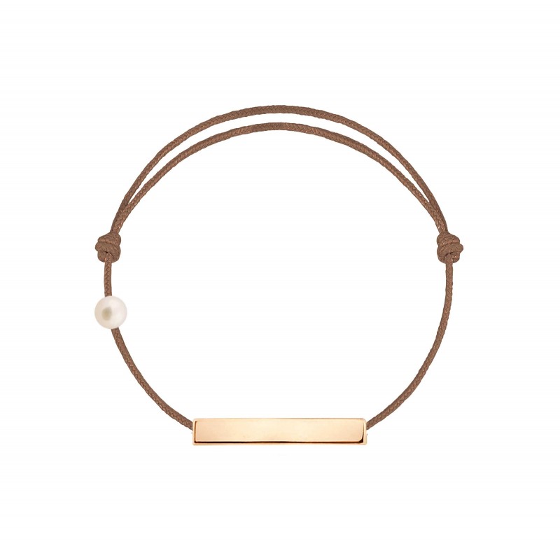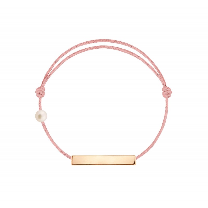 Plaque en or rose 18 carats, gravée Claverin au verso, et perle de culture blanche 3 mm sur bracelet cordon, ajustable au moyen de noeuds coulissants.