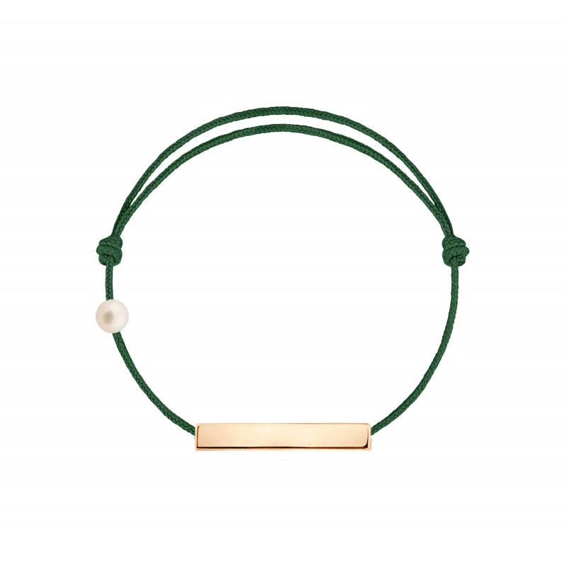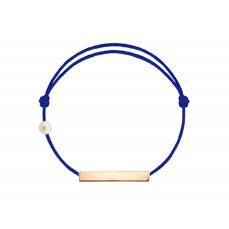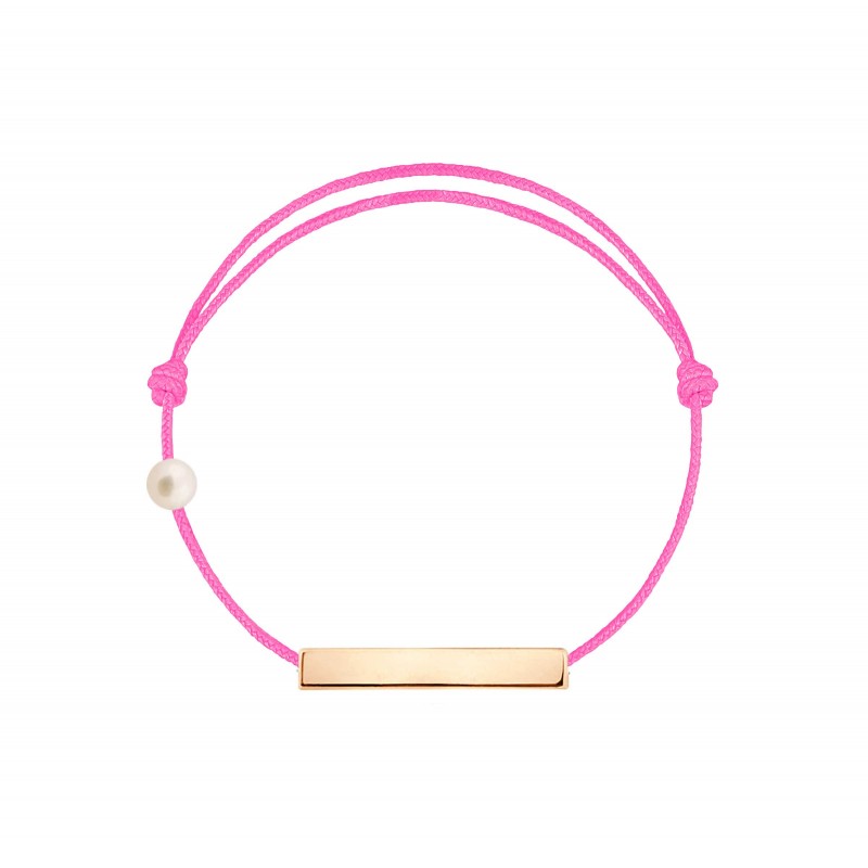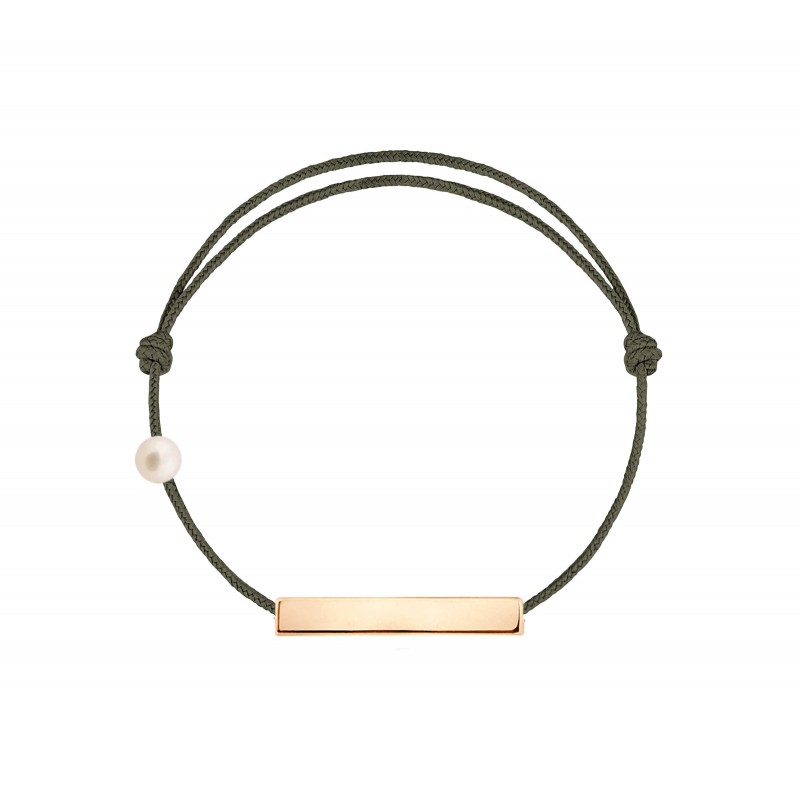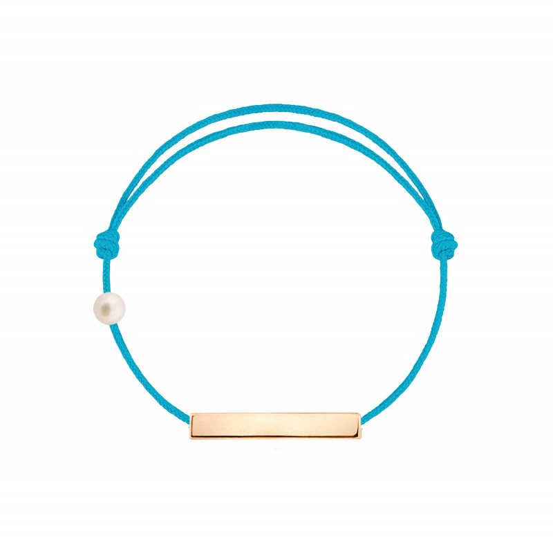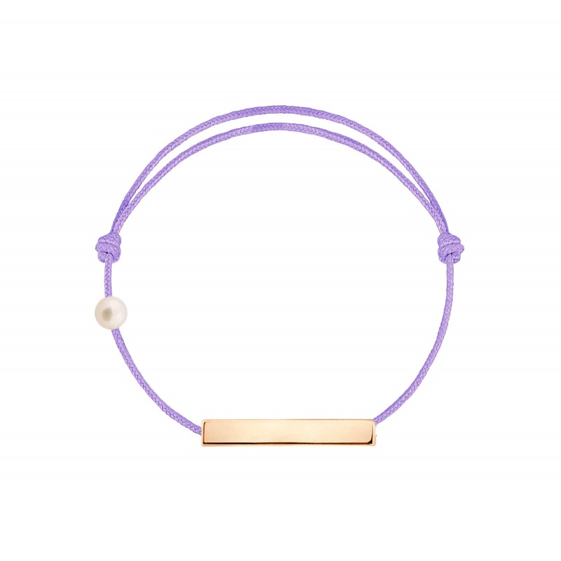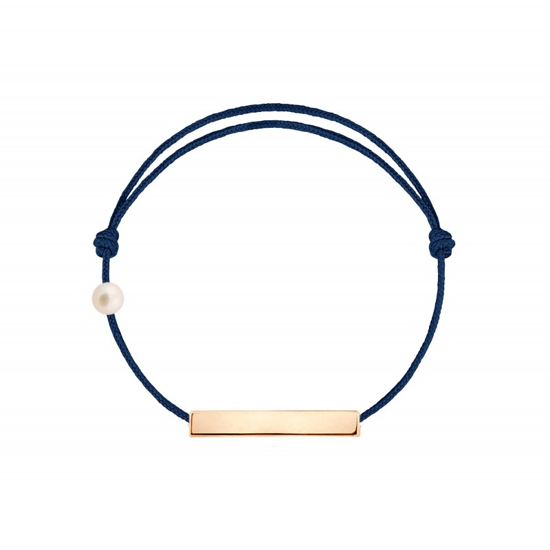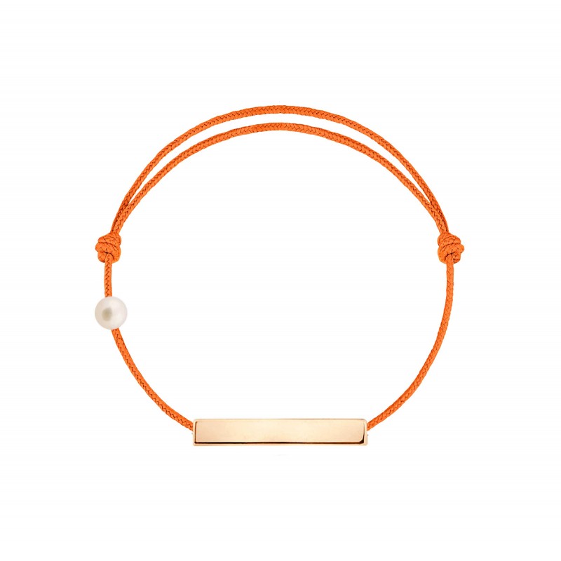 Plaque en or rose 18 carats, gravée Claverin au verso, et perle de culture blanche 3 mm sur bracelet cordon, ajustable au moyen de noeuds coulissants.