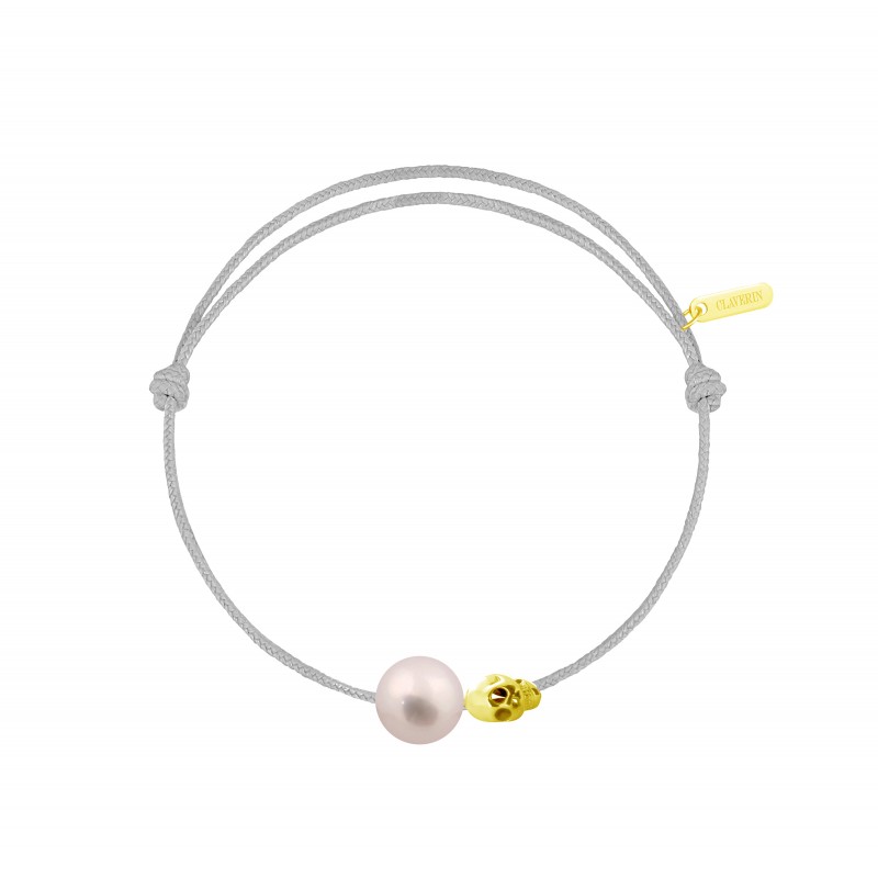 Bracelet cordon, ajustable au moyen de noeuds coulissant avec une perle de culture blanche 7/8mm, une tête de mort en or jaune 18 carats.