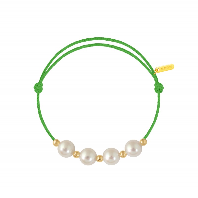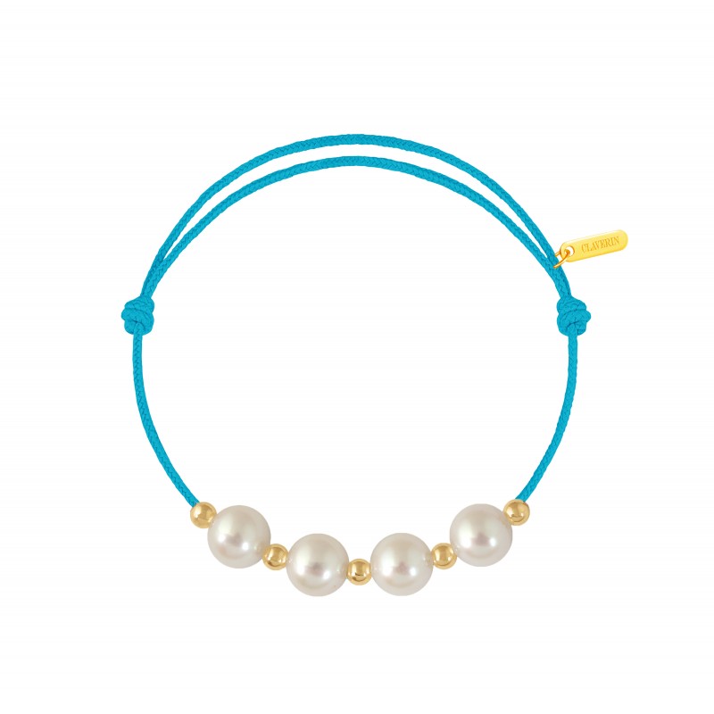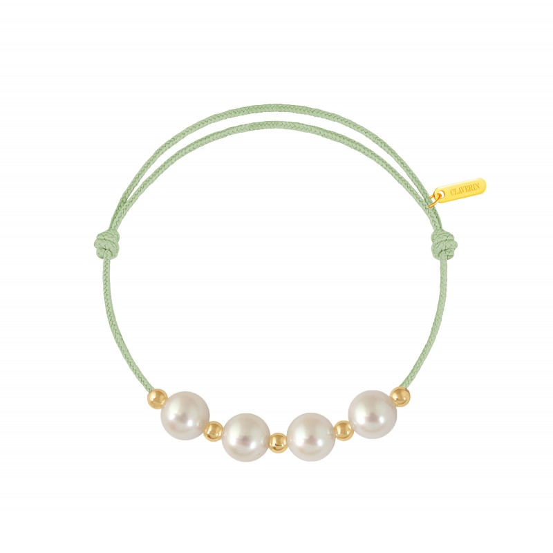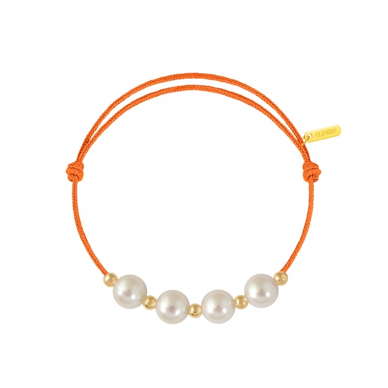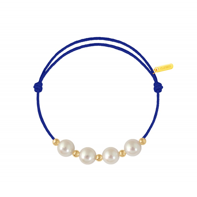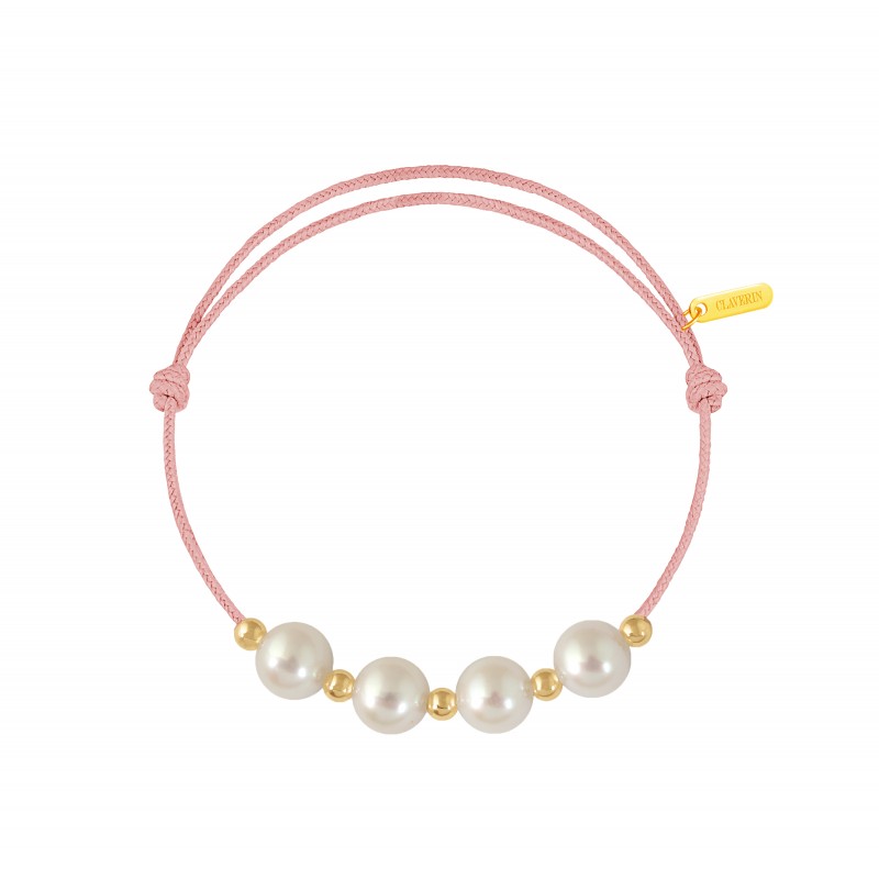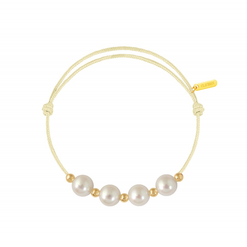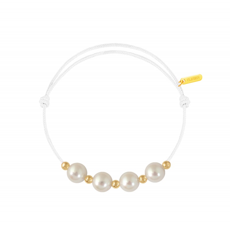Bracelet cordon, ajustable au moyen de noeuds coulissant avec 4 perles blanches 7/7,5 mm et 5 boules or jaune 3mm. Plaque gravée "Claverin" en or jaune 18 carats.