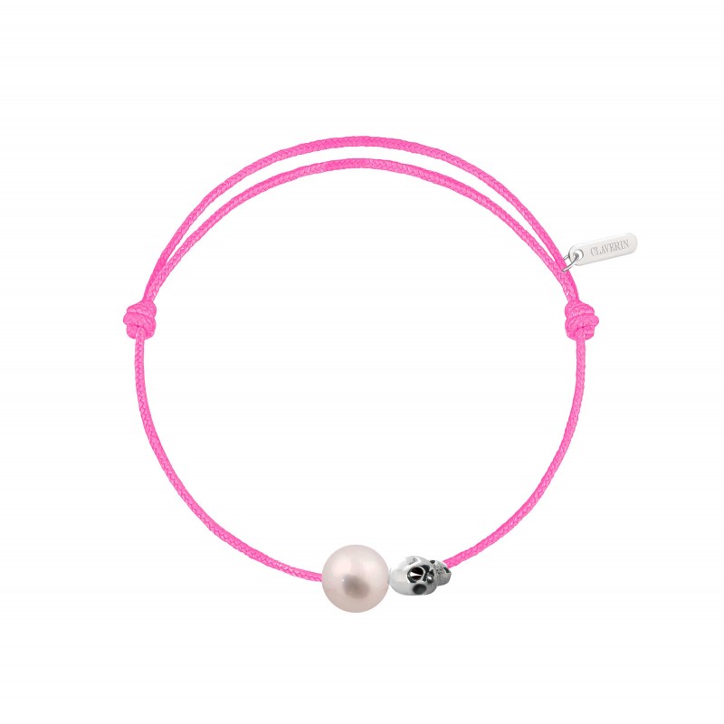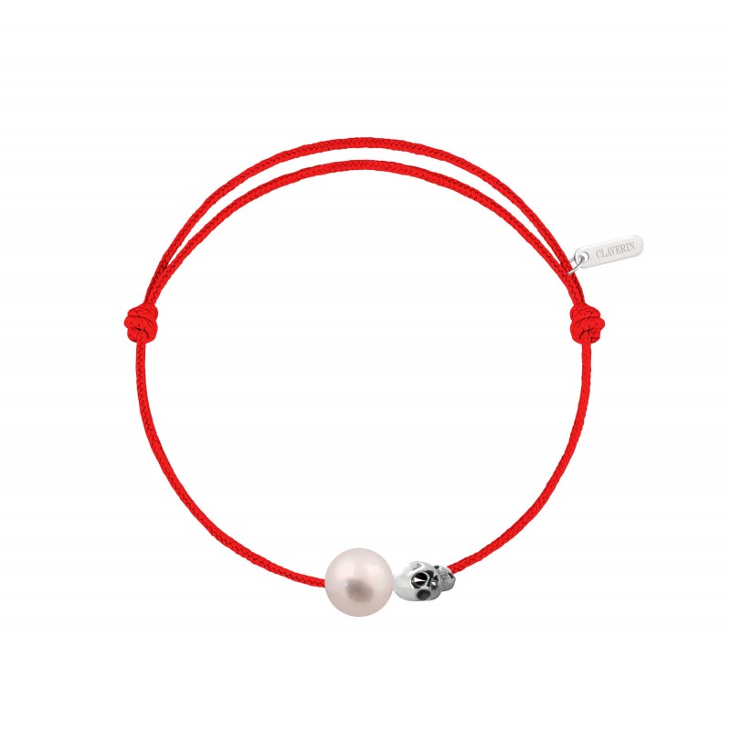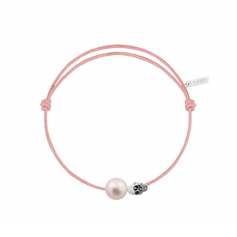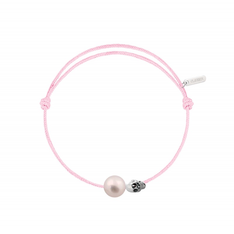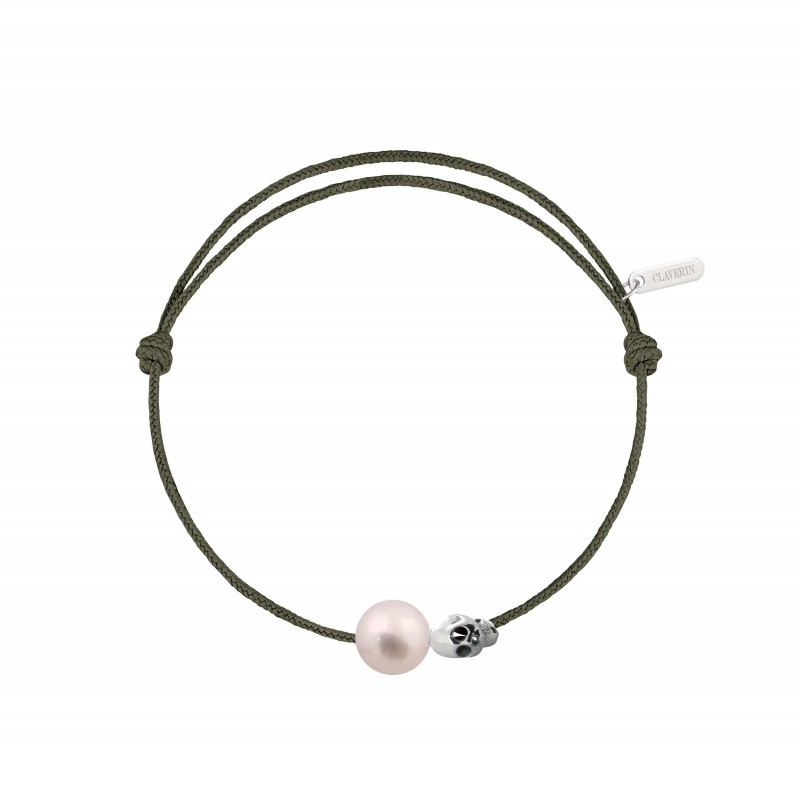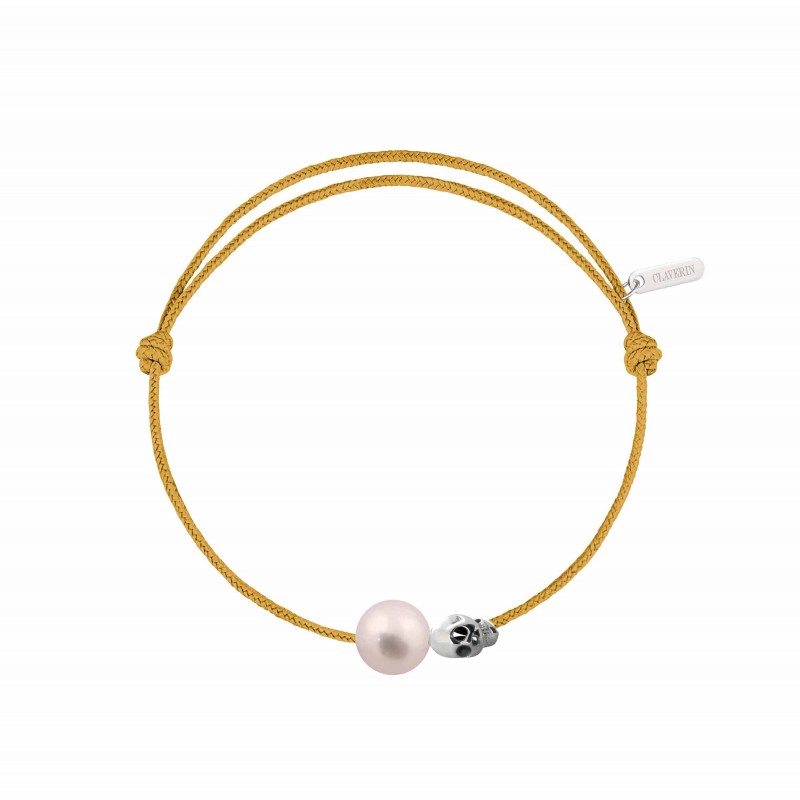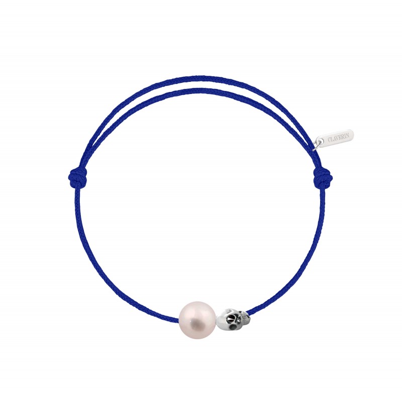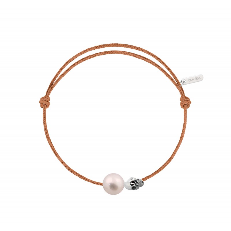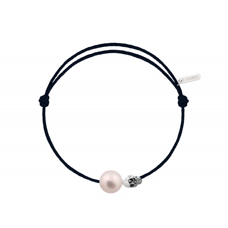 Bracelet cordon, ajustable au moyen de noeuds coulissant avec une perle de culture blanche 7/8mm, une tête de mort en or blanc 18 carats.
