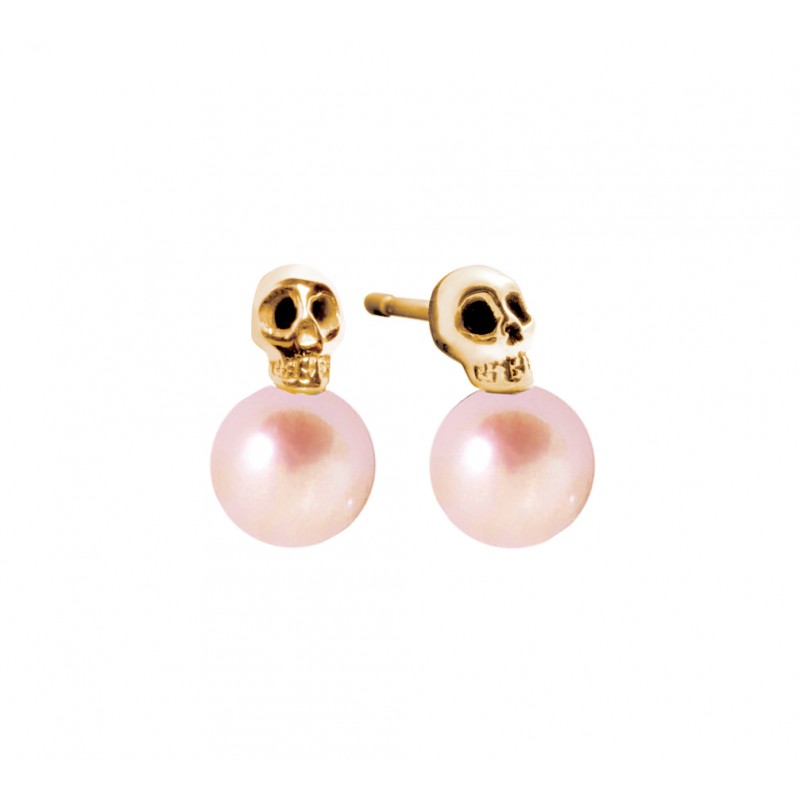 Boucles d'oreilles perle rose (6/6,5 mm) liée à une tête de mort en or jaune 18 carats.