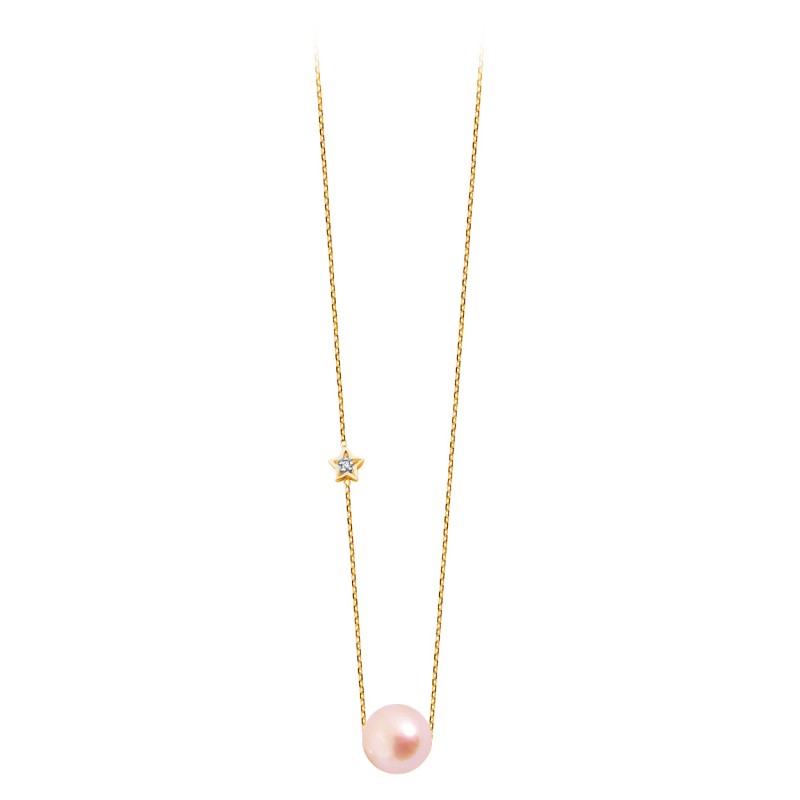 Pendentif perle rose (diamètre 7/7,5 mm) sur chaine en or jaune 18 carats d'une longueur de 38, 40 ou 42 cm avec les contre-anneaux, motif étoile diamant en or jaune 18 carats