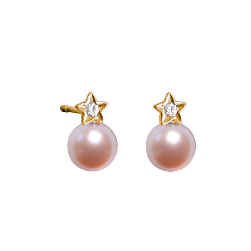 Boucles d'oreilles perle rose (6/6,5 mm) liée à une étoile ornée d'un diamant, en or jaune 18 carats.