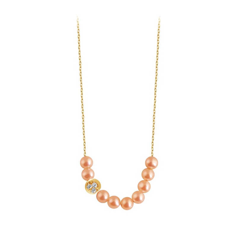 Rosary Diamond Moon, 9 perles roses de 3/4 mm et motif diamond moon - demi-lune en or jaune 18 carats sertie diamants - sur chaîne en or jaune 18 carats d'une longueur de 38, 40 ou 42 cm avec les contre-anneaux, les perles sont libres sur la chaine.