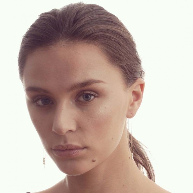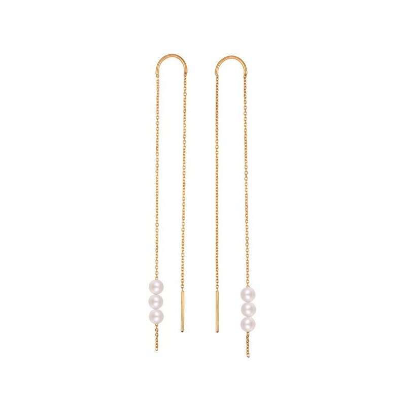 Boucles d'oreille en or jaune 18 carats, chaine forçat fine, 3 perles de culture 3/4 mm blanches