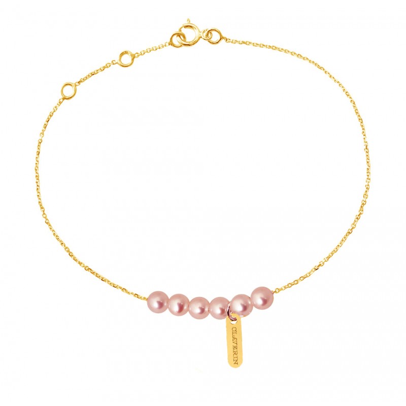 Bracelet 6 perles roses de 3/4 mm, sur chaîne fine en or jaune 18 carats d'une longueur de 17,5 cm avec contre anneau à 15,5 et 16,5 cm. Les perles sont fixées à la chaîne.
