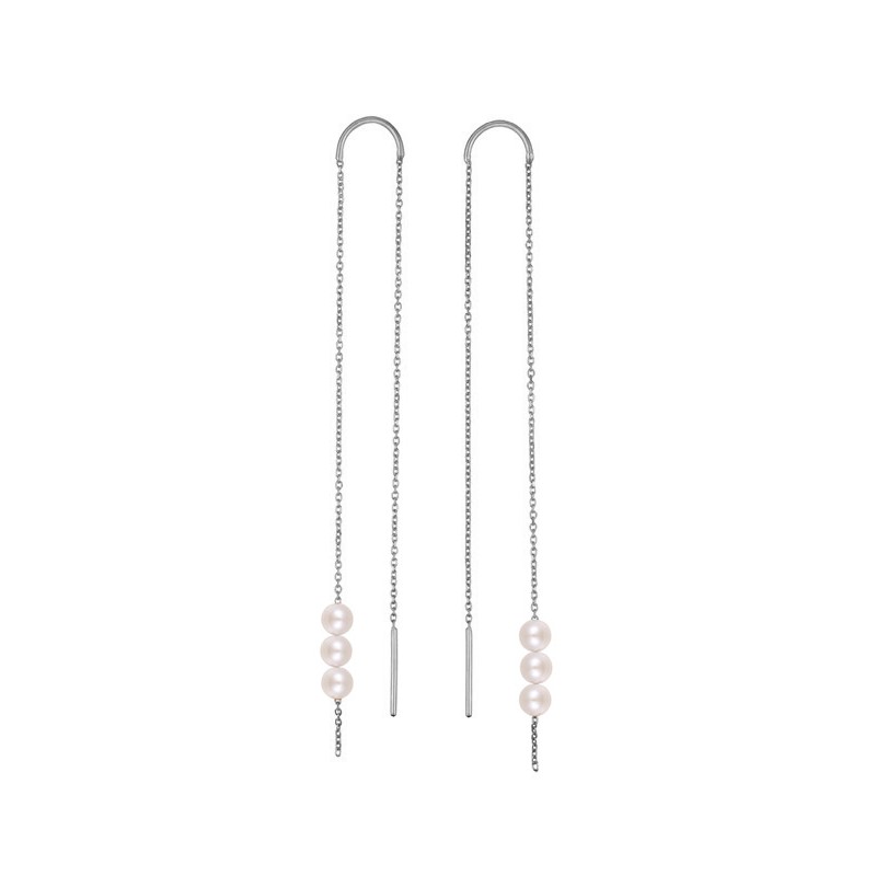 Boucles d'oreille en or blanc 18 carats, chaine forçat fine, 3 perles de culture 3/4 mm blanches