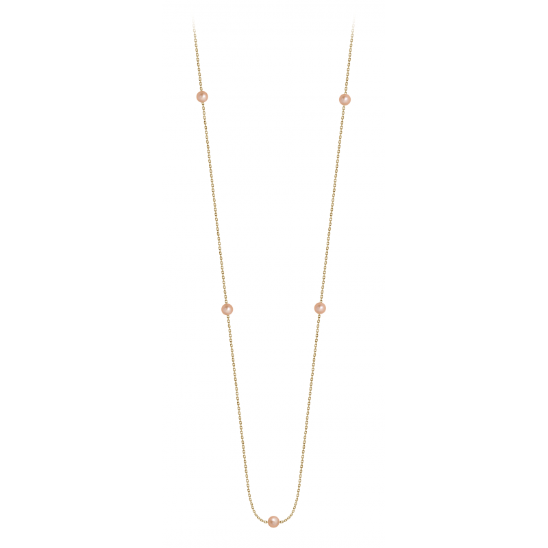 Collier Give me 5, cinq perles roses 3/4 mm symétriques sur chaine en or jaune 18 carats d'une longueur de 38, 40 ou 42 cm avec les contre-anneaux.