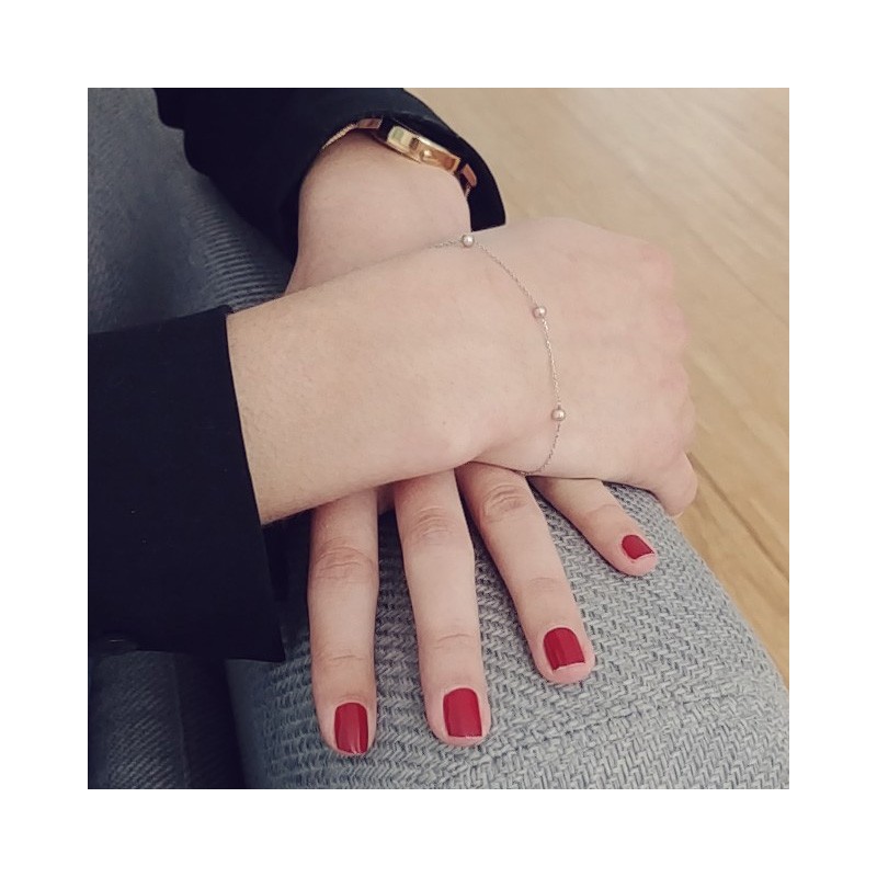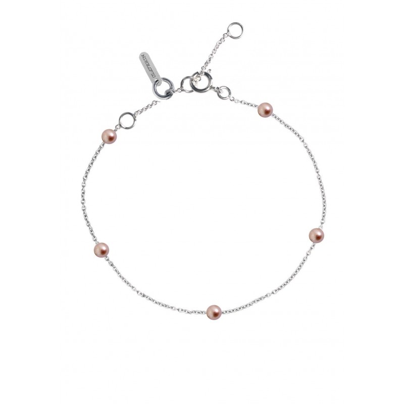 Bracelet 5 perles roses de 3/4 mm, sur chaine fine en or blanc 18 carats de 17,5 cm avec deux contre-anneaux.