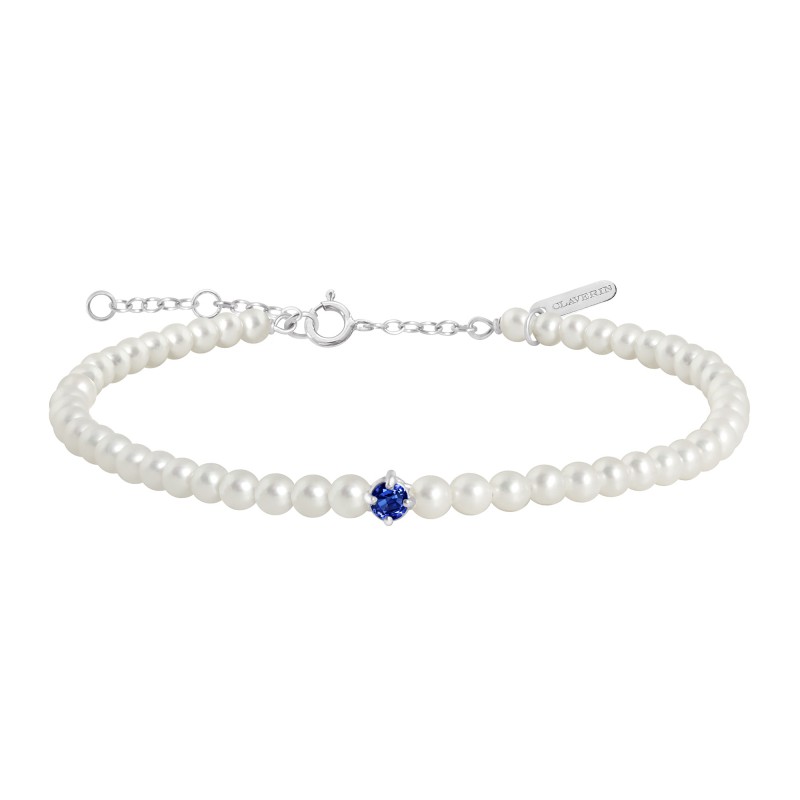 Bracelet composé d'environ 45 perles blanches 3/3,5mm et d'un saphir 3 mm serti sur chaton 4 griffes en or blanc et d'une plaque Claverin en or blanc. Le bracelet possède 3 contre-anneaux permettant de le régler aux diamètres 15,5/16,5/17,5 cm.