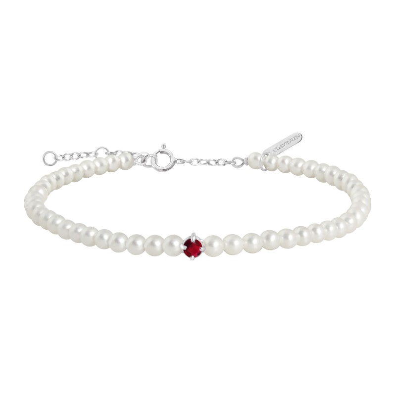 Bracelet composé d'environ 45 perles blanches 3/3,5mm et d'un rubis 3 mm serti sur chaton 4 griffes en or blanc et d'une plaque Claverin en or blanc. Le bracelet possède 3 contre-anneaux permettant de le régler aux diamètres 15,5/16,5/17,5 cm.