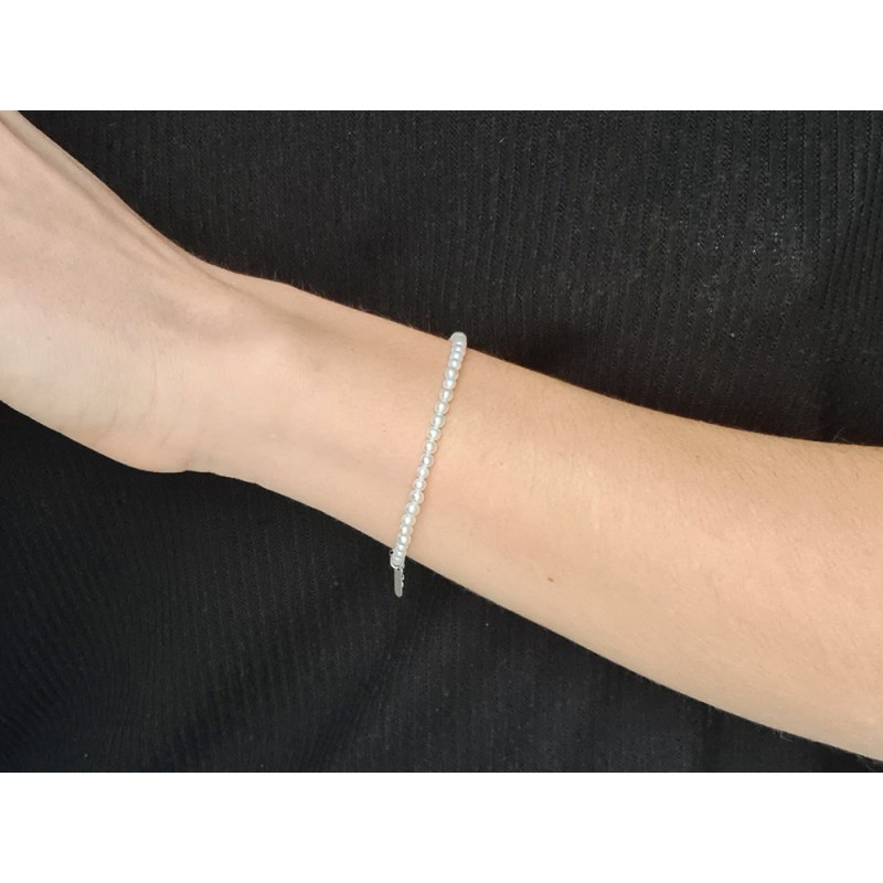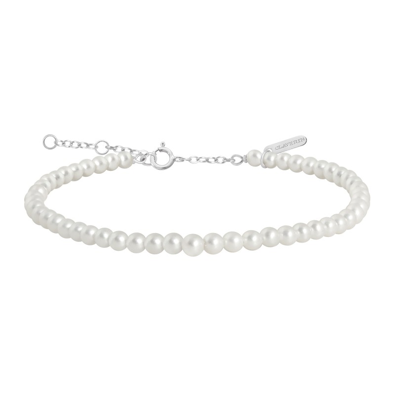 Bracelet composé d'environ 45 perles blanches 3/3,5mm et d'une plaque Claverin en or blanc. Le bracelet possède 3 contre-anneaux permettant de le régler aux diamètres 15,5/16,5/17,5 cm.