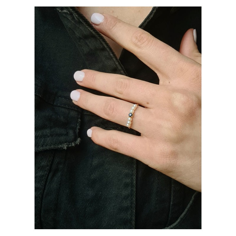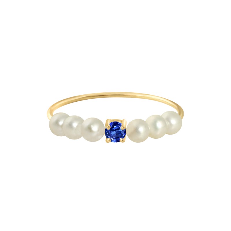 Bague anneau en or jaune 18 carats composée d'un saphir 3 mm serti sur un chaton 4 griffes, entouré de 6 perles blanches 3/3,5 mm