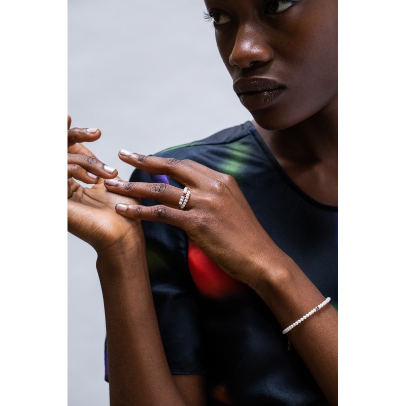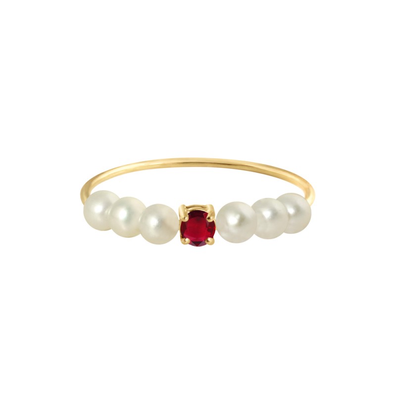 Bague anneau en or jaune 18 carats composée d'un rubis 3 mm serti sur un chaton 4 griffes, entouré de 6 perles blanches 3/3,5 mm